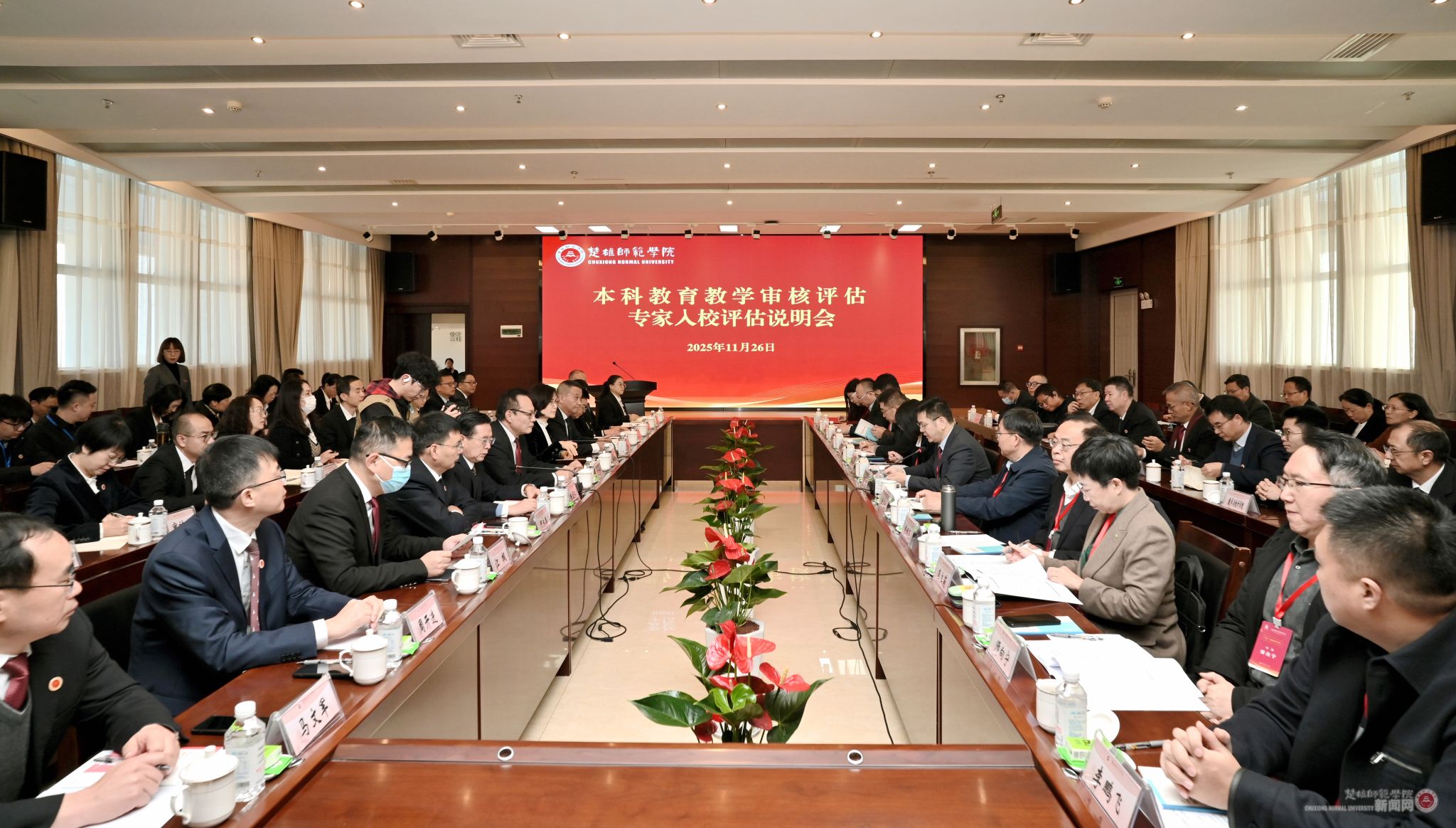 11月4日至28日,教育部本科教育教学审核评估专家组以线上线下相结合的方式,对我校本科教育教学工作进行全面系统评估。11月26日至28日,专家组组长、南宁师范大学校长隆广庆教授,副组长、洛阳师范学院原党委副书记宋文献教授及专家组成员一行11人进校开展为期3天的实地考察。26日上午的入校评估说明会与28日上午的意见交流会先后在教师进修综合楼召开。楚雄州副州长魏欣,省教育厅高教处、州教体局等有关负责人出席意见交流会。我校全体校领导,各职能部门、二级学院处、科级干部、专业负责人、教师代表和学生代表参加入校评估说明会和意见交流会。