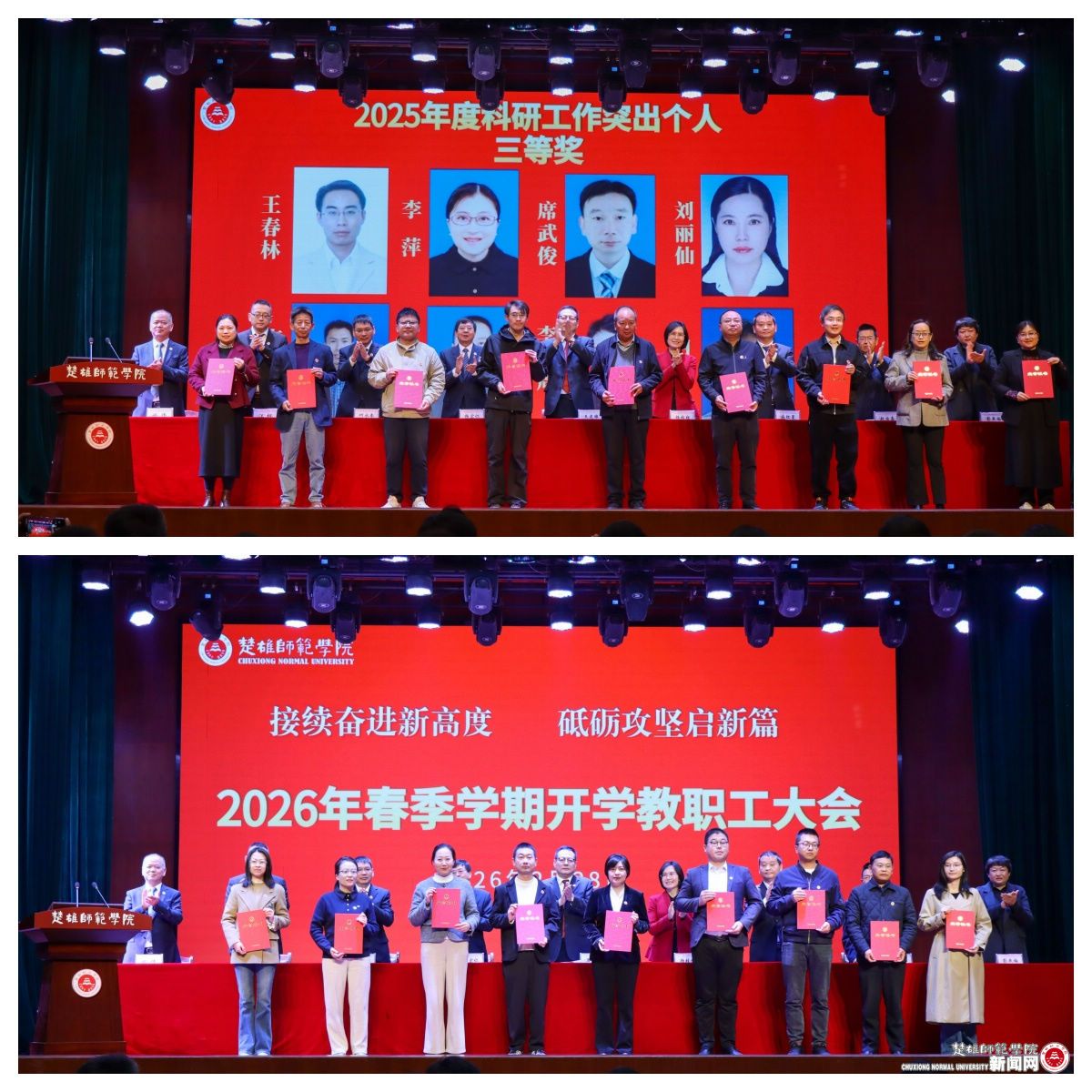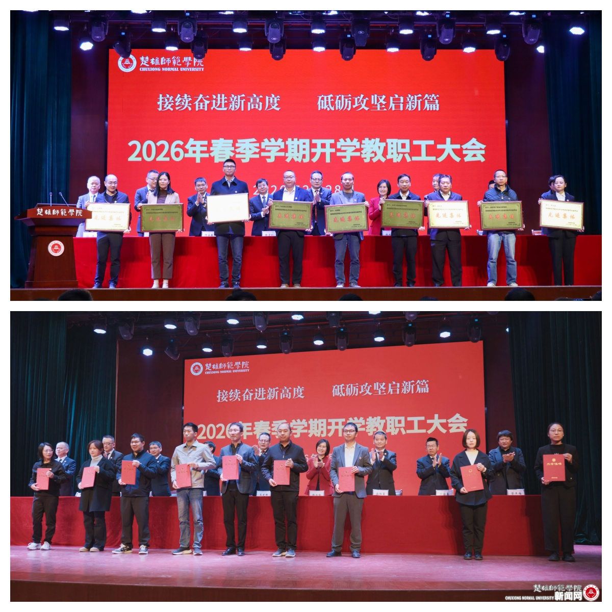 会议对2025年度本科教育教学审核评估先进集体和先进个人、科研工作突出个人、教研工作突出个人进行了表扬,学校领导为获奖代表颁奖,勉励他们珍惜荣誉、再接再厉,号召全体教职工以先进为榜样,砥砺奋进、争创佳绩。