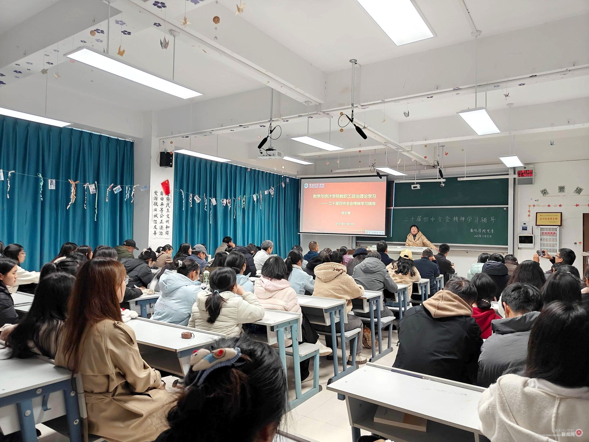 数学与统计学院召开学习辅导会议,邀请学校理论宣讲团成员陈文清教授作专题辅导。陈文清教授从党的二十届四中全会精神的基本情况、“十四五”时期成就、“十五五”时期任务三个方面进行系统介绍,并结合自身研究,为师生梳理了需要领会和把握的重点内容。辅导脉络清晰、重点突出,有效增进了大家对全会精神的理解。