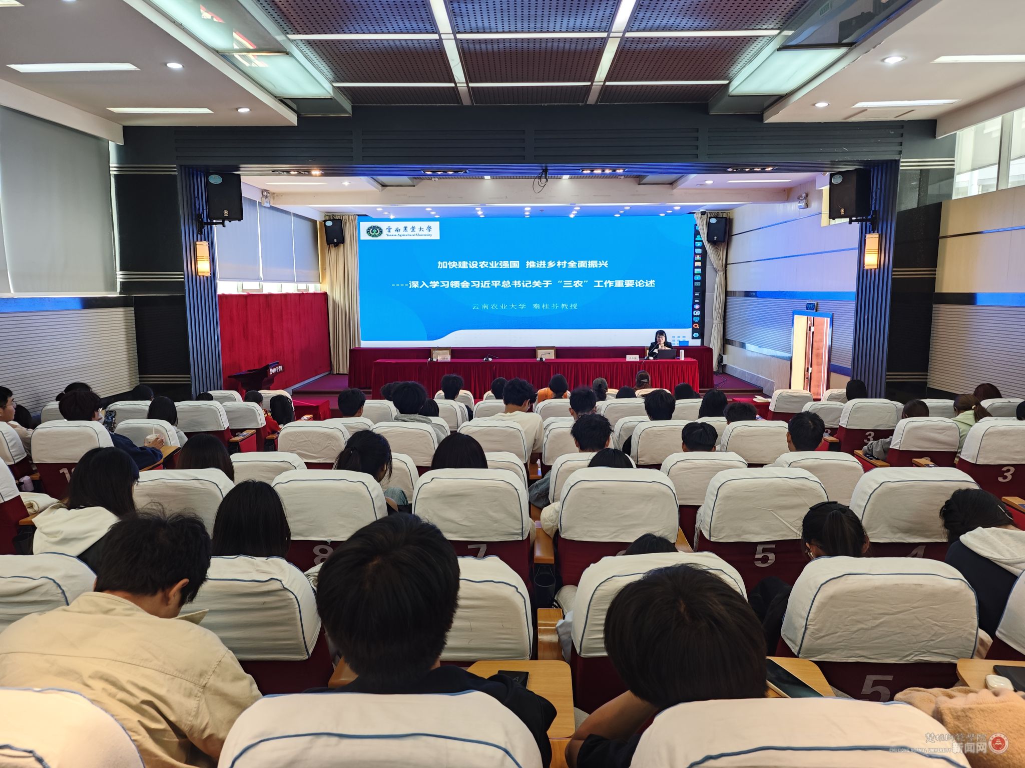 11月12日下午,我校在花果山校区信息楼第一报告厅,举行“云岭大讲堂·楚雄师范学院雁山讲坛”第104期专题报告,邀请云岭大讲堂主讲嘉宾、云南农业大学秦桂芬教授作题为“加快建设农业强国 推进乡村全面振兴——深入学习领会习近平总书记关于‘三农’工作重要论述”的学术讲座。农学院食用菌科学与工程、园艺等专业100余名学生参加活动,讲座由科研院副院长刘丽仙主持。