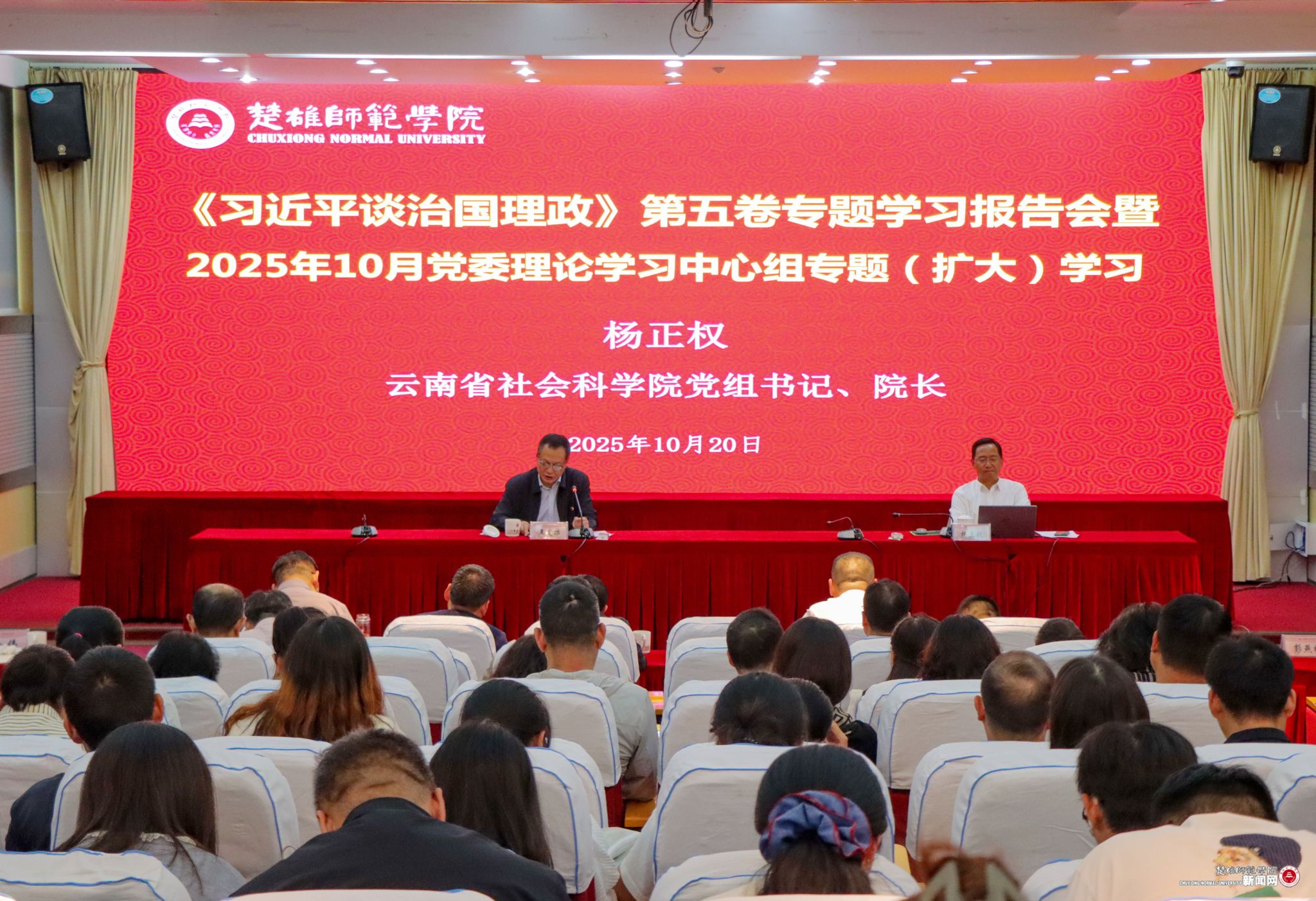 10月20日,学校在花果山校区信息楼第一报告厅举行《习近平谈治国理政》第五卷专题学习报告会暨2025年10月党委理论学习中心组专题(扩大)学习,特邀云南省社会科学院党组书记、院长杨正权到校作“深入学习贯彻《习近平谈治国理政》第五卷”专题辅导。学校党政领导班子成员、全体处级干部、职能部门全体科级干部、2025年青马工程学员代表参加会议。学校党委书记王建雄主持会议并提学习贯彻要求。杨正权紧紧围绕重大意义、丰富内容、重大理论创新、...
