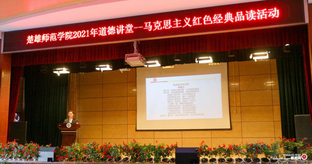 为深入学习贯彻习近平总书记在党史学习教育动员大会上的重要讲话,进一步贯彻落实好习近平总书记“多读、精读一些马克思主义经典作家的著作,多读、精读一些马克思主义中国化的经典篇章”的重要指示批示精神,按照学校党史学习教育总体安排和工作部署,以学校文明创建“道德讲堂”活动为载体,10月25日下午,“党史学习教育专题读书班暨楚雄师范学院2021年道德讲堂——马克思主义红色经典品读”活动在雁塔校区上礼堂举行。
