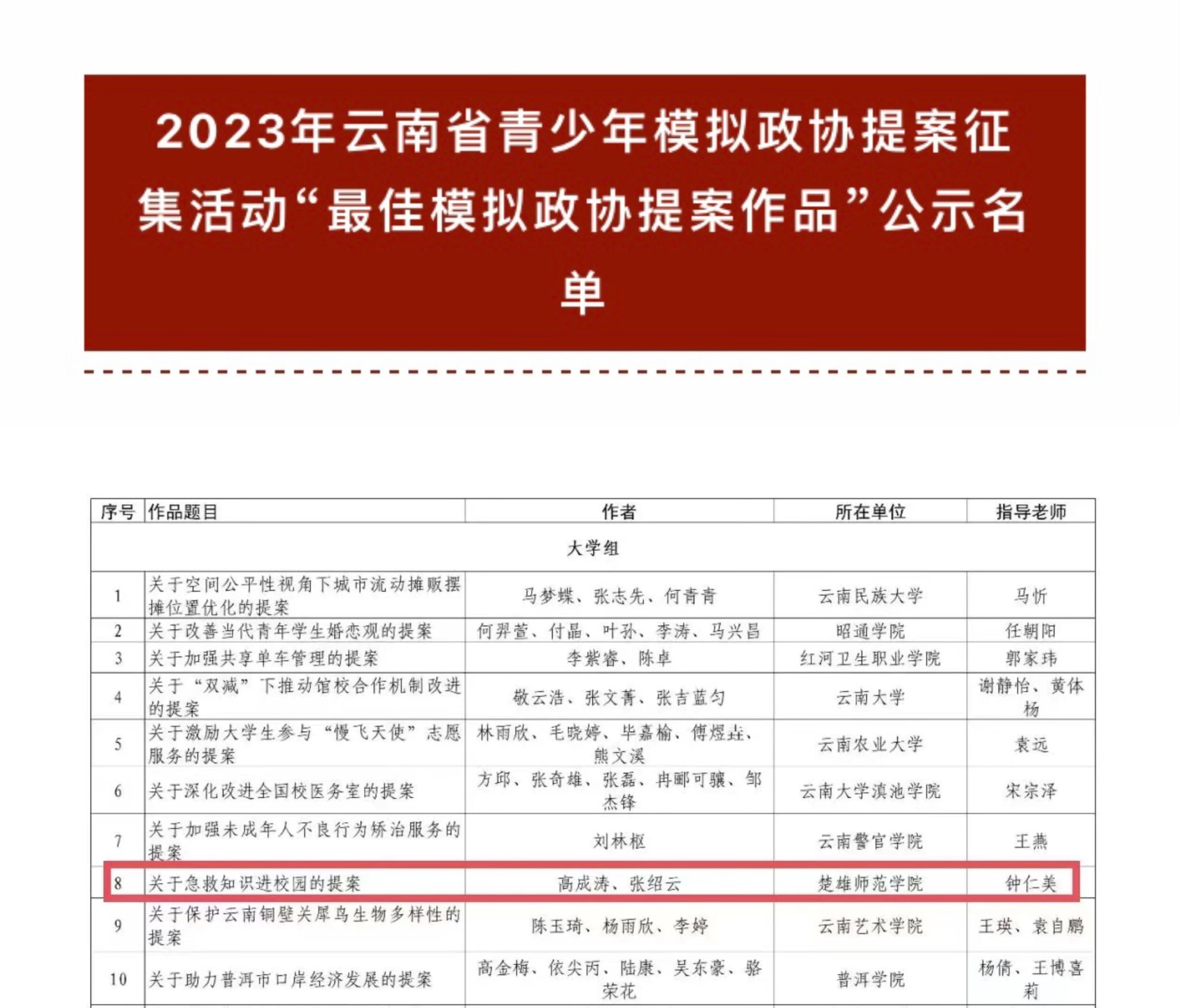 近日,由共青团云南省委主办的2023年云南省青少年模拟政协提案征集活动评审结果公布。经各州(市)、高校团委审核推荐,团省委初评、复评、终评,我校1项作品入选“最佳模拟政协提案作品”。