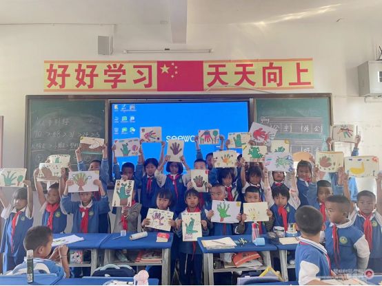 第二次来到这所学校帮扶,施苗苗面对学生更显得游刃有余,也多了些思考。在课后服务的教学过程中,有位学生让施苗苗印象深刻。“他总是想法很多,但是不知道如何通过绘画表达出来。”施苗苗耐心引导,用自己的方法鼓励学生勇敢尝试。“渐渐的,他越来越自信,会把作品拿给我猜他要表达什么,我猜对了,他笑得好大声。”在施苗苗看来,美育带来的不光是审美和绘画能力的提升,更是创新思维和科学思维的结合。