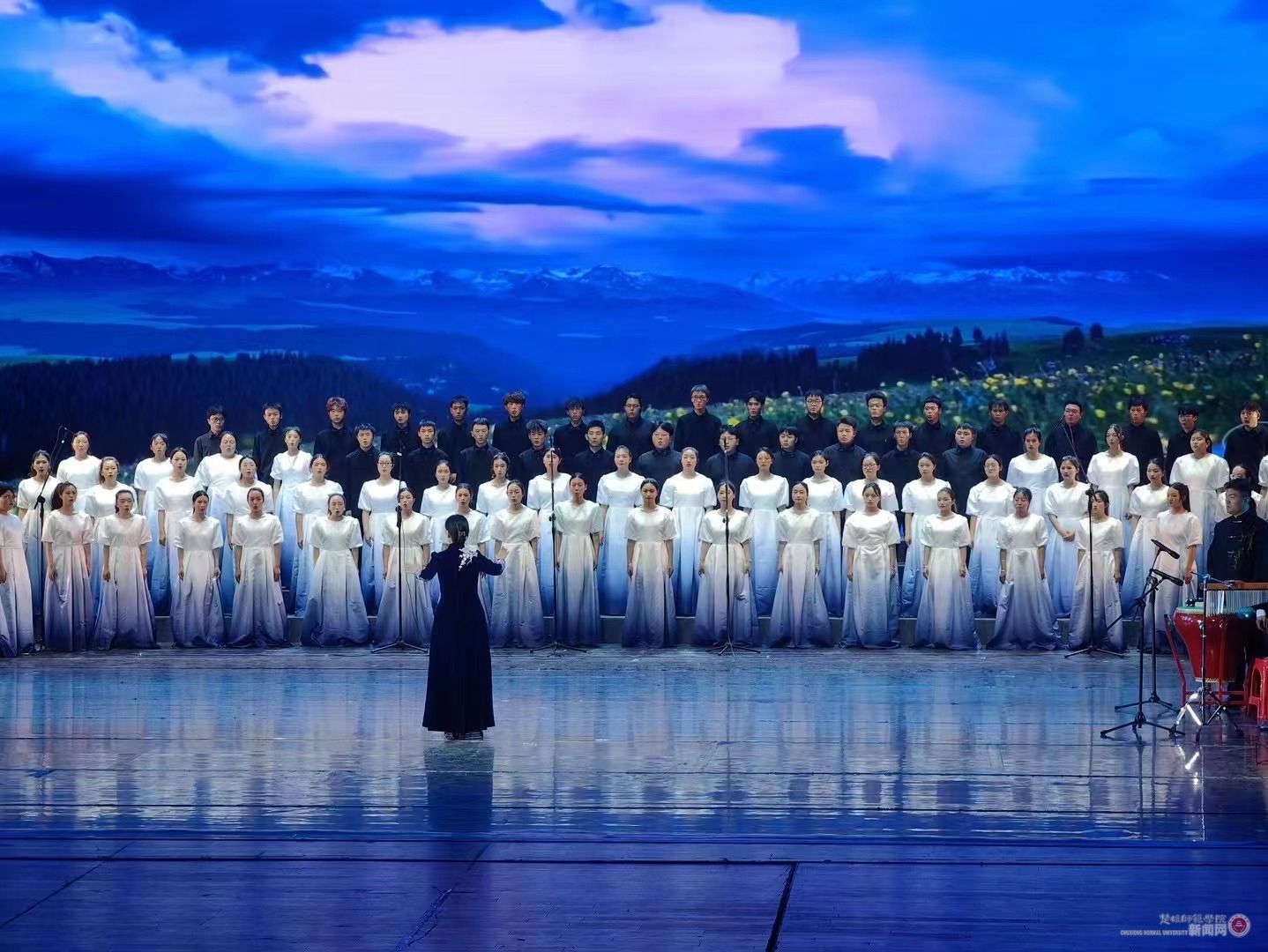 我校作品《敕勒川》由教育学院、校团委、学生工作部编排选送,教育学院江燕老师担任指挥、赵燚老师担任钢琴伴奏,79名学生倾情演唱。队员们以饱满的热情、良好的精神面貌和高亢激昂的歌声,唱出了敕勒人热爱家乡热爱生活的豪情,用音乐元素讲述民族团结的佳话,展现多民族的大融合。
