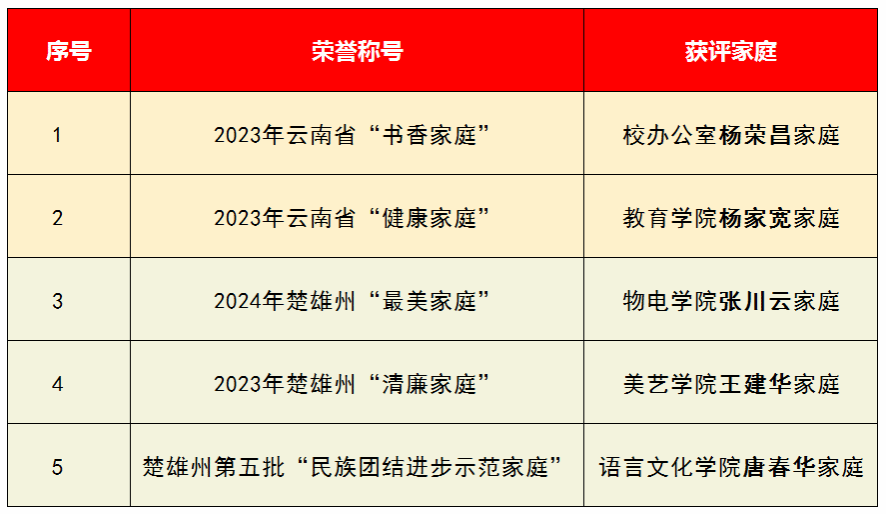 近日,云南省妇联和楚雄州妇联陆续公布“书香家庭”“健康家庭”“最美家庭”“清廉家庭”“民族团结进步示范家庭”等名单,我校共有五个家庭先后入选。其中,杨荣昌家庭获评为2023年云南省“书香家庭”,杨家宽家庭获评为2023年云南省“健康家庭”,张川云家庭获评为2024年楚雄州“最美家庭”,王建华家庭获评为2023年楚雄州清廉家庭,唐春华家庭获评为楚雄州第五批“民族团结进步示范家庭”。