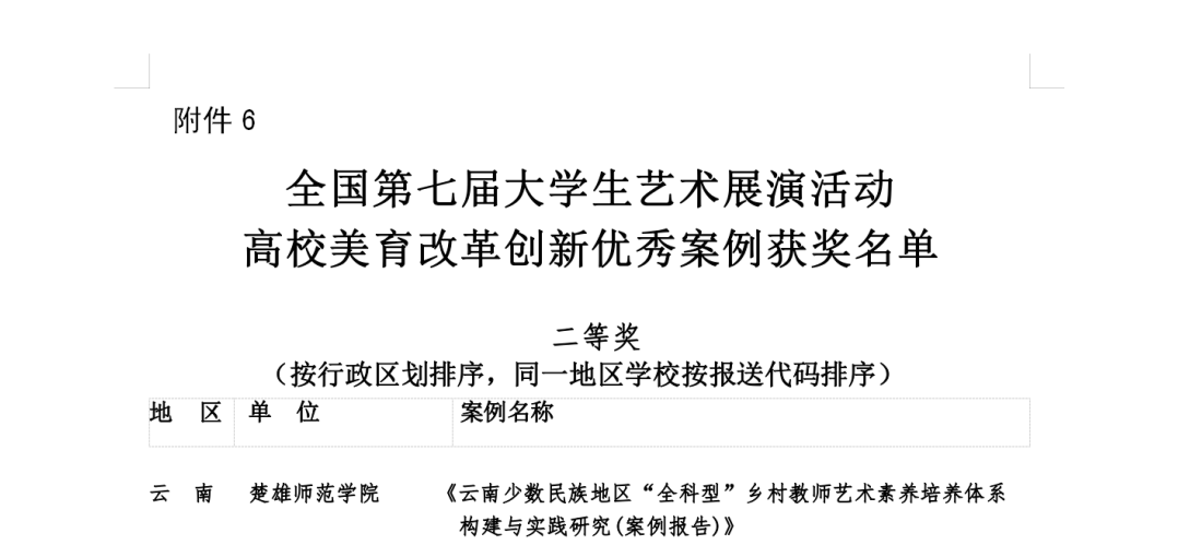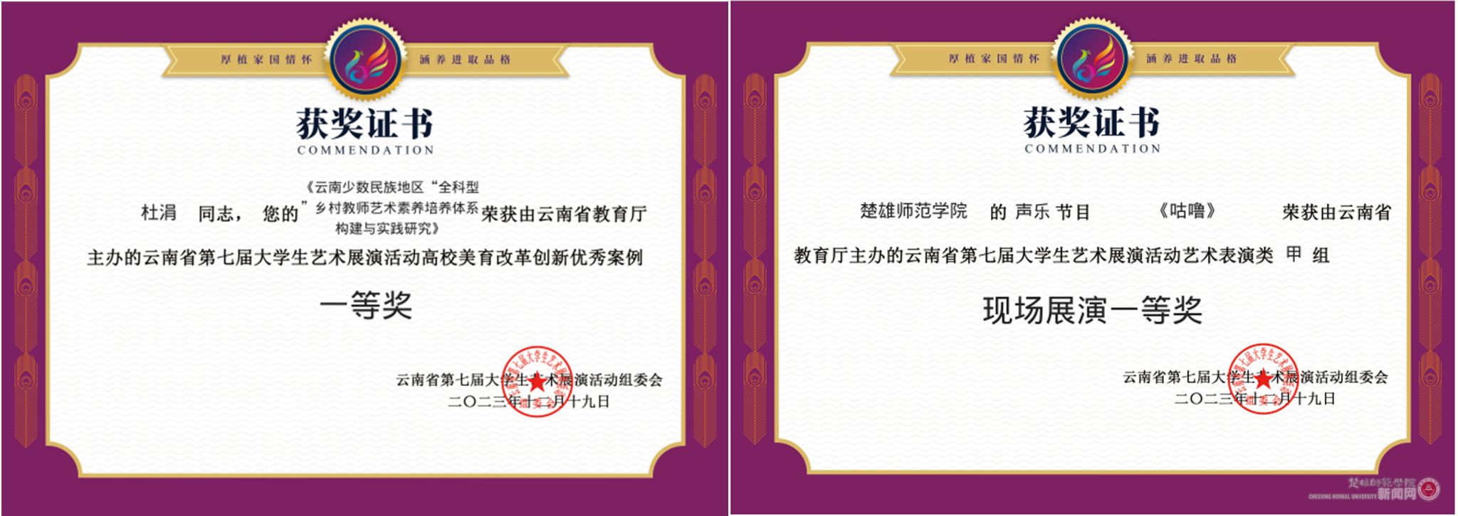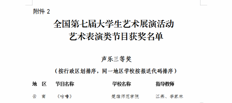 近日,全国第七届大学生艺术展演活动优秀组织奖及各项目评选结果公布。我校报送的高校美育改革创新优秀案例《云南少数民族地区“全科型”乡村教师艺术素养培养体系构建与实践研究》(作者杜涓)荣获高校美育改革创新优秀案例全国二等奖,艺术表演类节目《咕噜》(指导教师江燕、李家林)荣获艺术表演类节目全国声乐三等奖,同时分别荣获云南省一等奖。