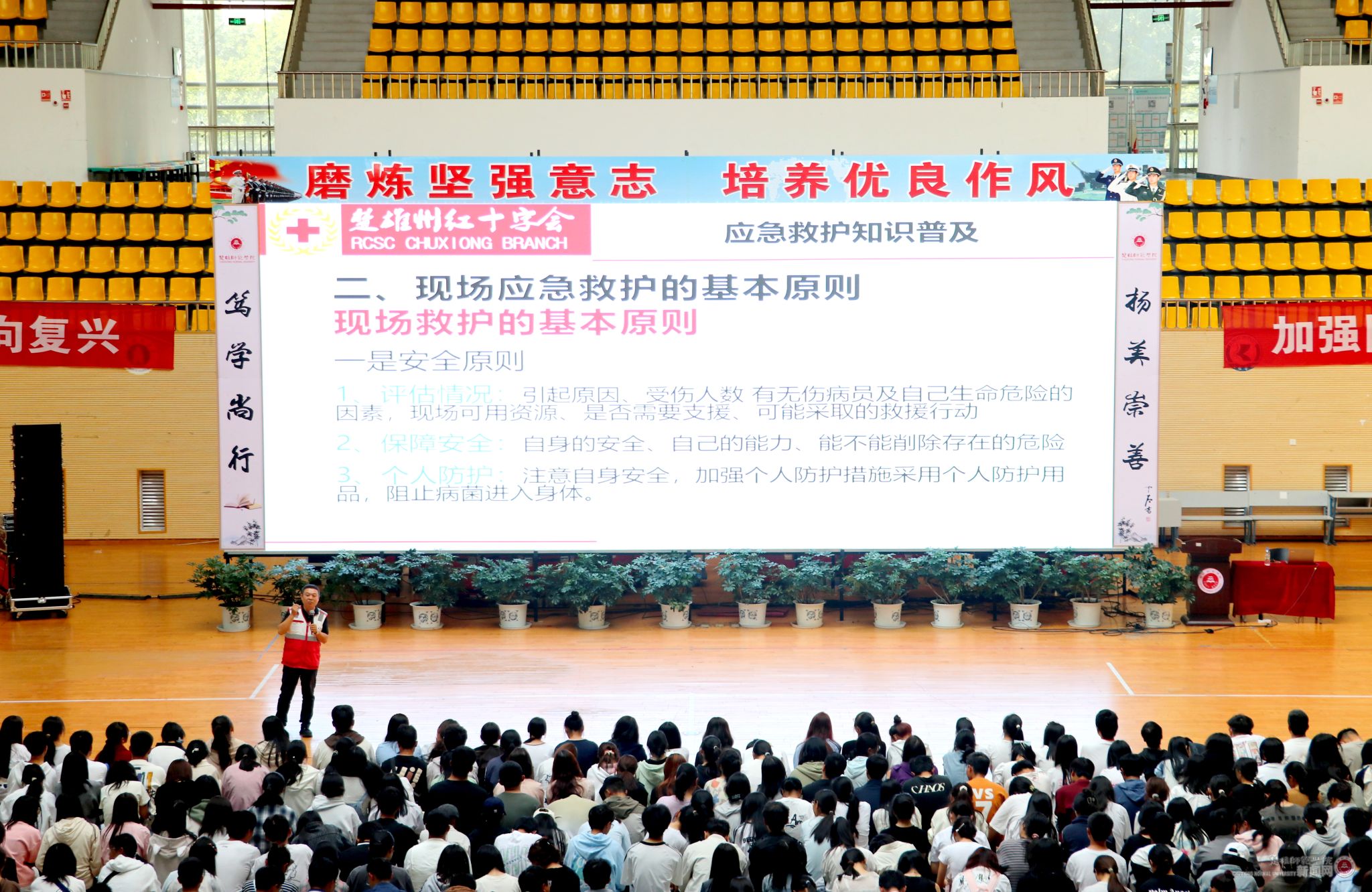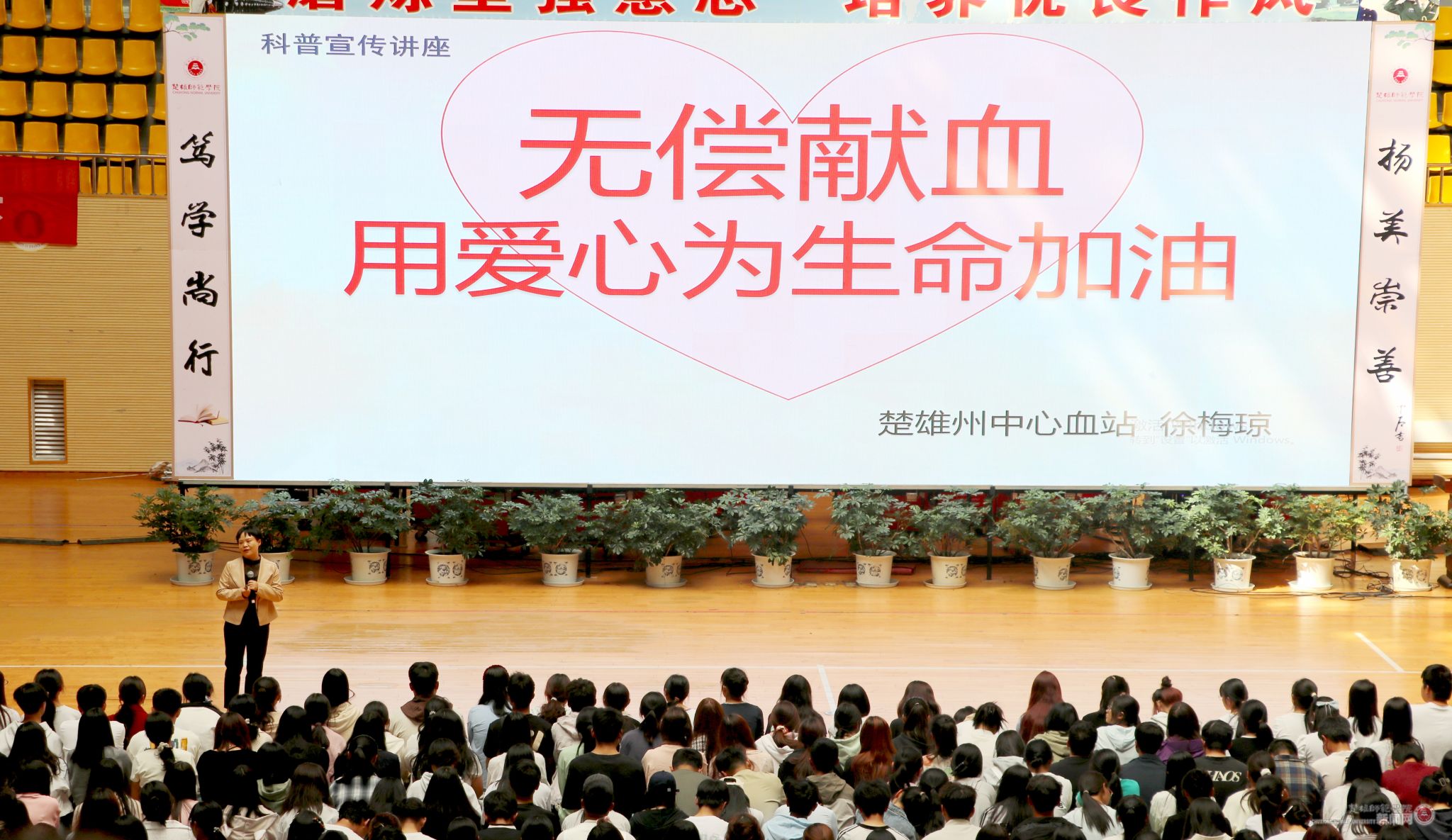 为增强学生的安全意识,倡导养成健康文明的生活方式,提高学生安全事件应对处置能力,10月17日,学校在学生会堂开展大学生安全健康主题教育活动,邀请楚雄州中心血站站长徐梅琼和楚雄州红十字会赈济救护科科长林鹏作专题培训。2000余名在校学生参加活动。