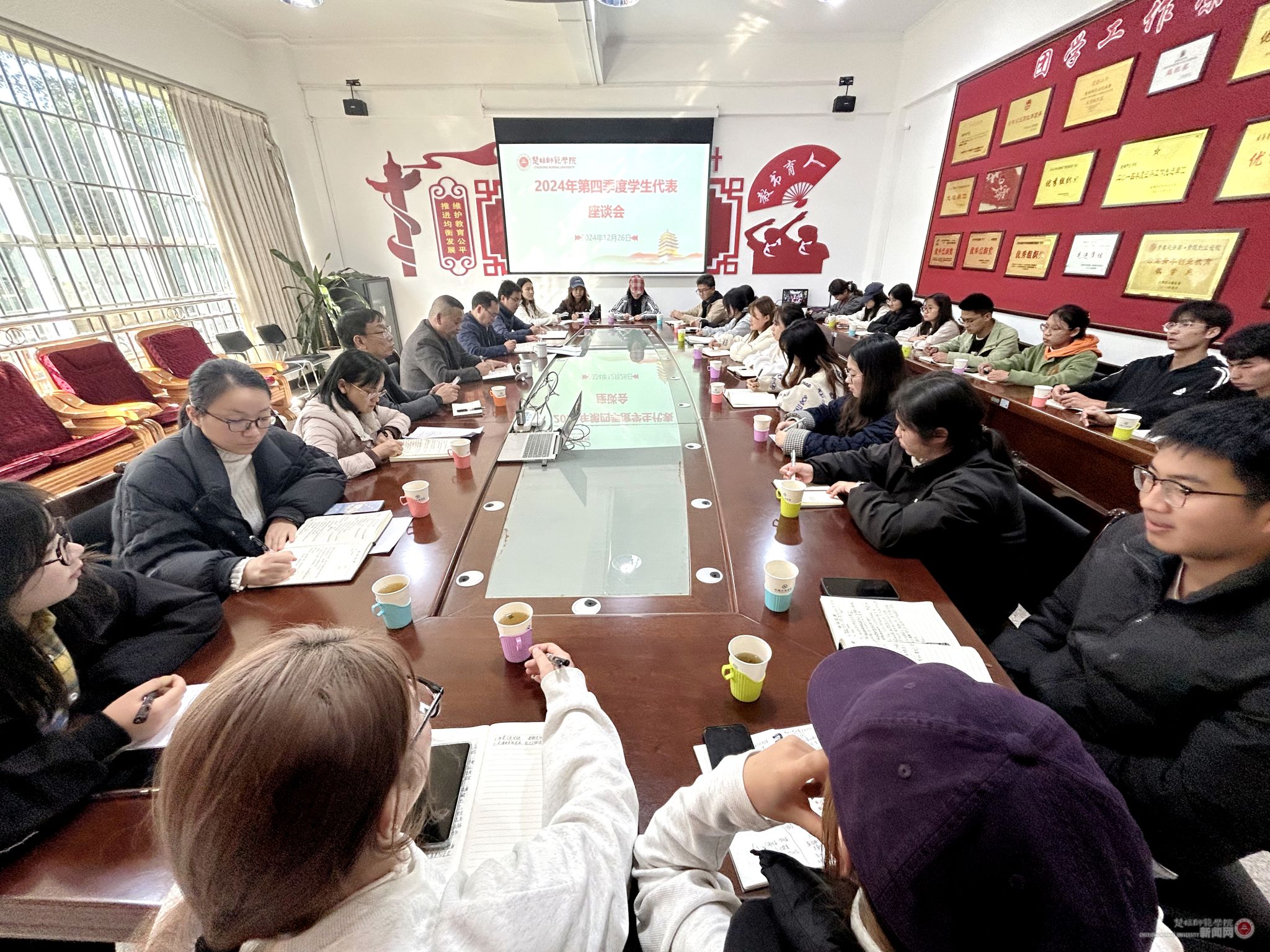 为深入贯彻落实习近平总书记在全国教育大会上的重要讲话精神和立德树人根本任务,倾听学生心声,解决学生发展诉求,12月26日下午,学校召开2024年第四季度学生代表座谈会。学院党委副书记施红星,宣传部、教务处、学工部、后勤总务部、图书馆、资信处、保卫部、校团委、体健学院相关负责人,各学院学生代表、校学生会、社团部等30余人参加座谈会。