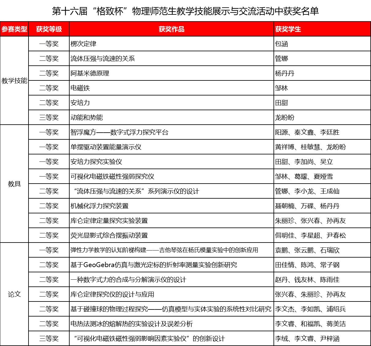 师范技能赛事方面,第十六届“格致杯”物理师范生教学技能展示活动中,学院21支队伍在教学技能、教具创新等板块表现亮眼,斩获国赛一等奖6项、二等奖13项、三等奖2项。其中《智浮魔方 —— 数字式浮力探究平台》《单摆驱动装置能量演示仪》等作品将智能技术融入物理教学,展现了师范生创新实践能力。
