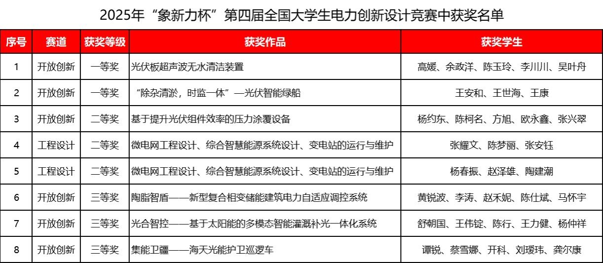 “象新力杯”第四届全国大学生电力创新设计竞赛聚焦新型能源体系建设,学院学子在开放创新与工程设计赛道中斩获一等奖2项、二等奖3项、三等奖3项,展现了电力领域创新潜力。