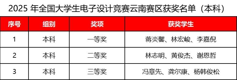 全国大学生电子设计竞赛云南赛区比赛中,蒋炎馨、林宏峻、李嘉倪团队的《高性能智能监测系统的设计与实现》项目斩获省赛一等奖,另有2支队伍分别荣获二等奖和三等奖。