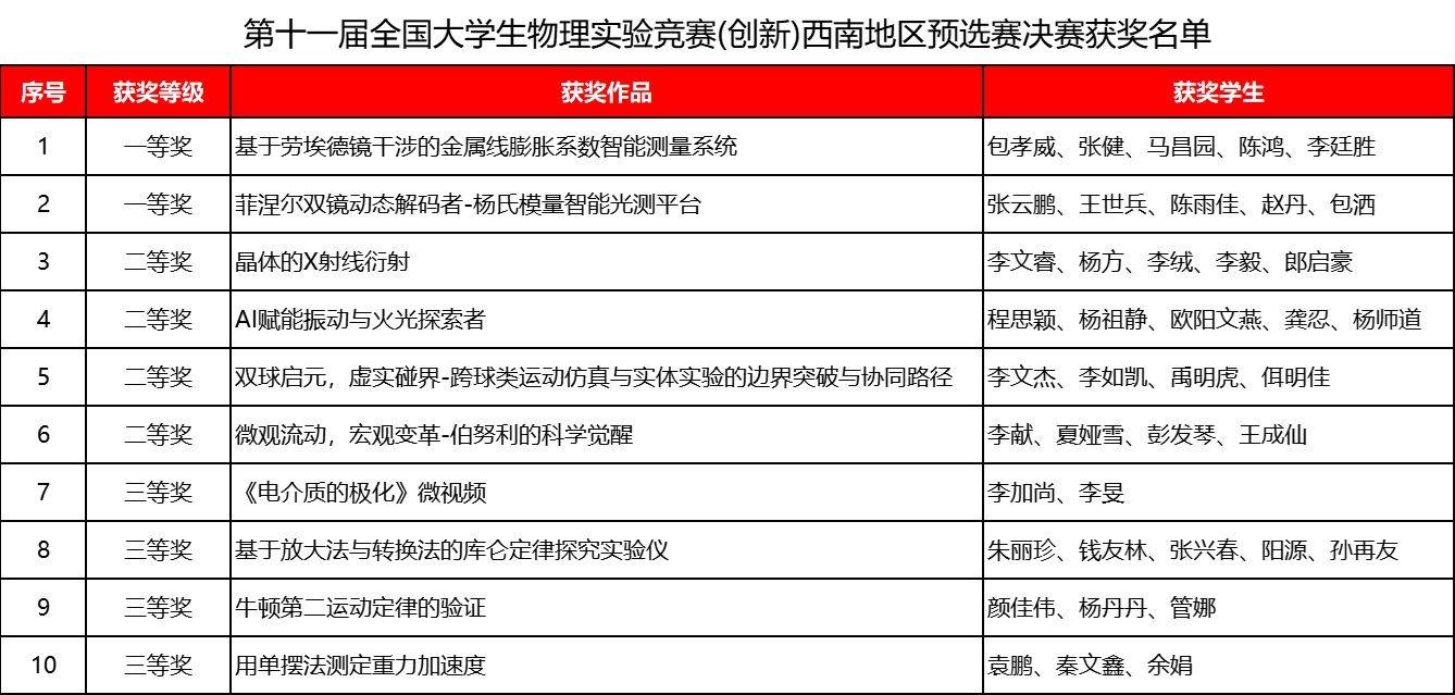 区域赛事中,西南地区大学生物理实验竞赛(创新)吸引了60所高校466支队伍同台竞技,学院10支队伍脱颖而出,获一等奖2项、二等奖4项、三等奖4项。