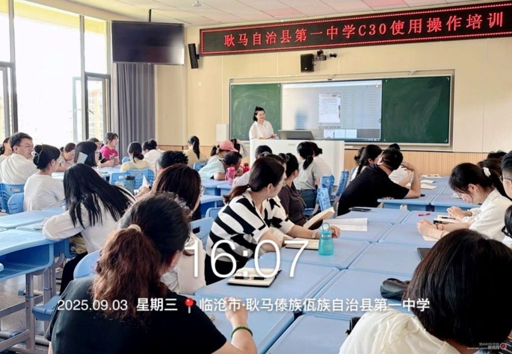 在沧源县民族中学,重点围绕AI智能作文模块开展深化培训,推动平台从“可用”向“用好”升级;在耿马县第一中学,组织新教师开展C30系统操作培训,该校领导高度重视并全程参与,有效提升教师信息化教学能力;在耿马县民族中学,针对语文组教师专项培训AI智能作文批阅功能,激发教师探索智慧教学新路径的热情。