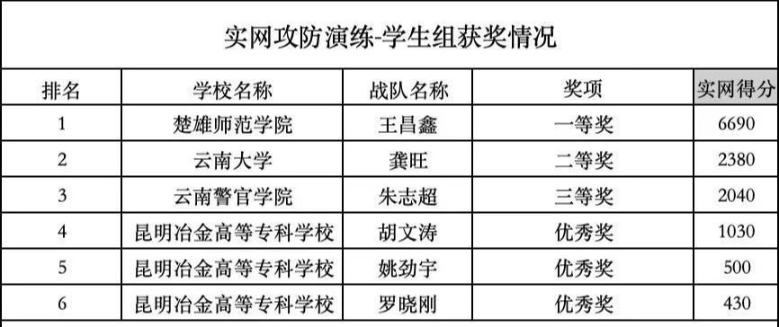近日,由云南省通信管理局、云南省公安厅、云南省工业和信息化厅联合主办的“铸牢防线 护航云网”实网攻防演练暨技能竞赛圆满落幕,我校计算机与智能技术学院2024级计算机科学与技术专业王昌鑫同学,凭借扎实的专业功底和出色的实战能力,以超高实网得分夺得学生组实网攻防赛道一等奖,这也是本赛道学生组全省唯一的一等奖。