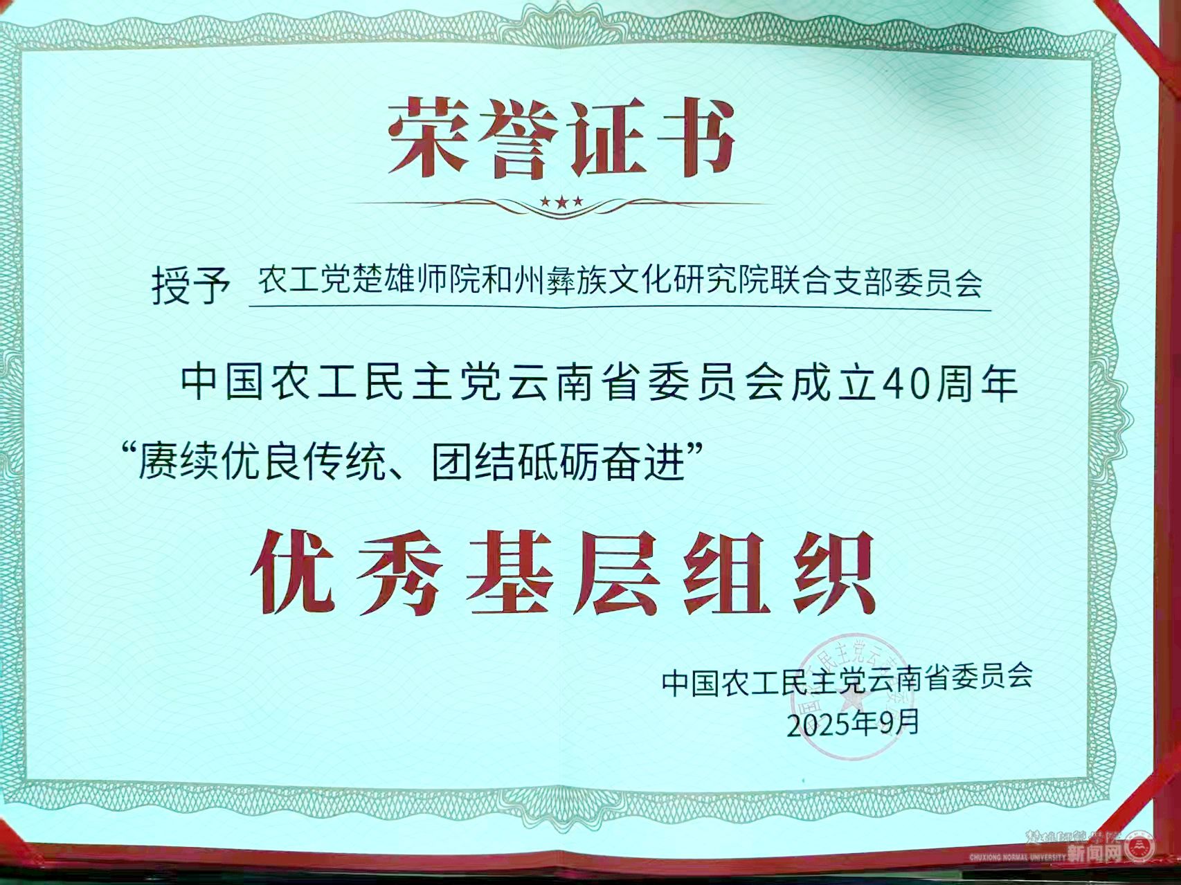 近日,中国农工党云南省委员会成立40周年纪念大会在昆明举行,会议对多年来涌现出的先进集体和优秀个人进行了表彰。农工党楚雄师院和州彝族文化研究院联合支部委员会荣获“优秀基层组织”称号。