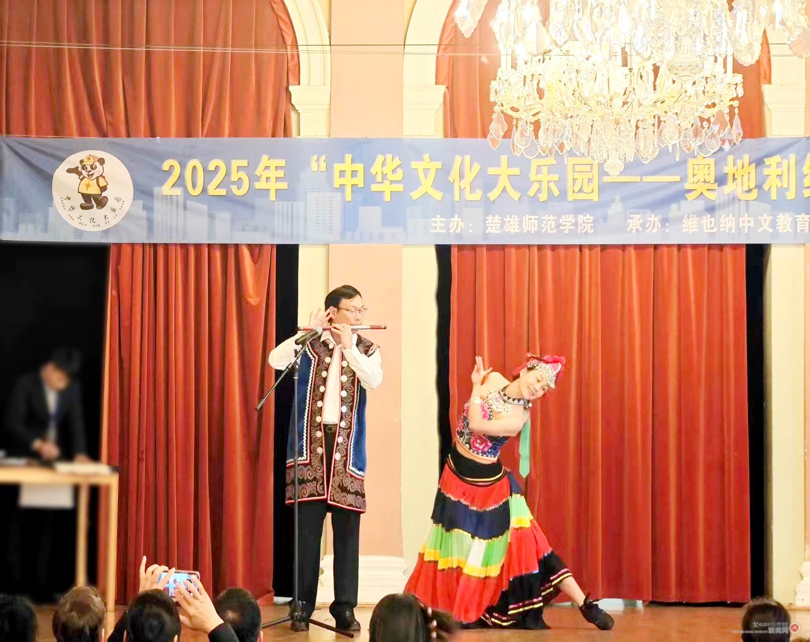 开幕式上,我校向大使馆、维也纳大学孔子学院、维也纳中文教育中心及来宾赠送了书法、彝绣等作品。我校教师还带来了精彩的中华文化展示表演,一首充满古典气息和人生感怀的《梨花颂》,悠扬婉转的民乐演奏《有一个美丽的地方》瞬间将现场观众带入浓郁的中国文化之美的意境;韵味十足的《阿惹妞》展现了彝族舞蹈的柔美与典雅;刚劲有力的武术表演《中国功夫》赢得了现场观众的阵阵掌声与欢呼声,场面温馨而热烈。我校教师还现场展示了书法、绘画、彝绣传统技艺,演奏了古筝、巴乌、葫芦笙等民族乐器,一幅幅精美的书法绘画作品、一首首悠扬动听的民族音乐、一幅幅精美的彝绣作品,让维也纳华裔青少年及家长近距离感受到了中华文化的独特魅力,现场互动氛围热烈。