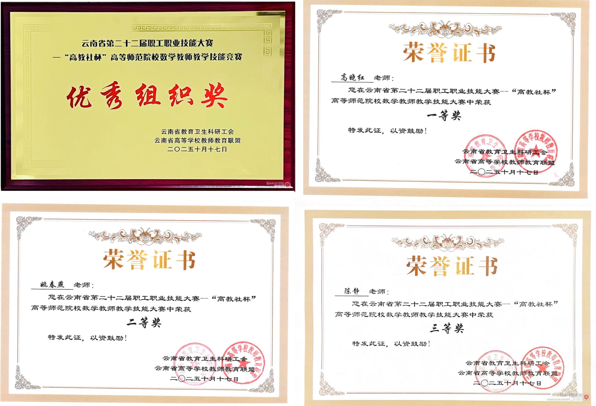 近日,云南省教育卫生科研工会、云南省高校教师教育联盟向我校寄来荣誉证书,我校选派的数学与统计学院高晓红、姚春燕、陈静三位教师,在云南省第二十二届职工技能大赛—“高教社杯”高等师范院校数学教师教学技能竞赛中分别荣获一、二、三等奖,学校因出色的组织工作和优异的团体表现,被授予“优秀组织奖”。