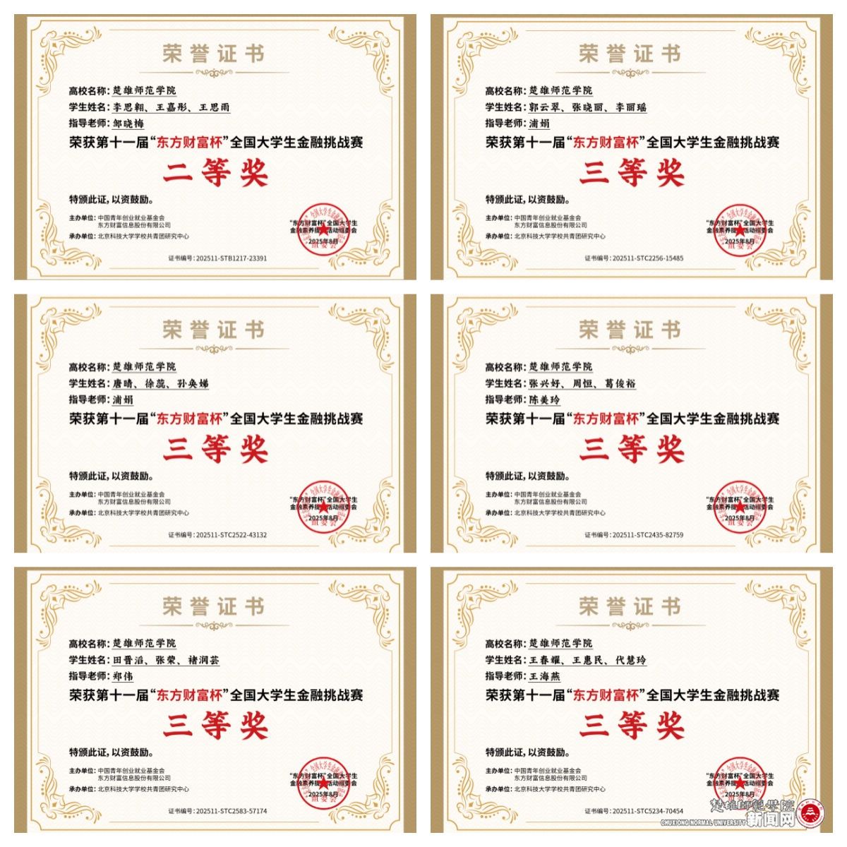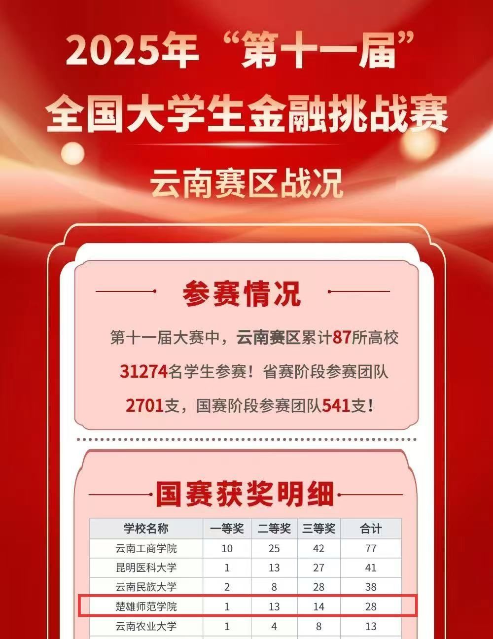 近日,由中国青年创业就业基金会、东方财富信息股份有限公司主办,北京科技大学学校共青团研究中心承办的第十一届“东方财富杯”全国大学生金融挑战赛圆满落幕,在学校精心组织下,广泛动员近3300名学生报名参赛。经校赛、省赛和国赛的激烈角逐,我校选派28支团队喜获国家级奖项28项(一等奖1项、二等奖13项、三等奖14项)。此外,在省赛中,获省级奖项85项(一等奖12项,省级二等奖30项,省级三等奖43项)。楚雄师范学院代表队,在云南赛区参赛的87所高校中排名第四。