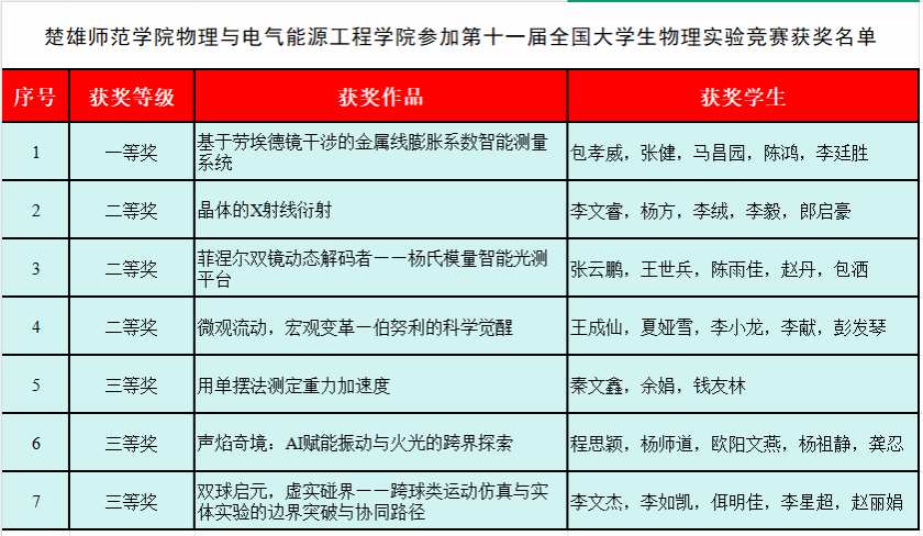 近日,第十一届全国大学生物理实验竞赛(创新)总决赛在中南大学举办。我校物理与电气能源工程学院派出的7支代表队历经激烈角逐,最终斩获全国一等奖1项、二等奖3项、三等奖3项,充分展现了我校学子扎实的实验功底与出色的创新能力。