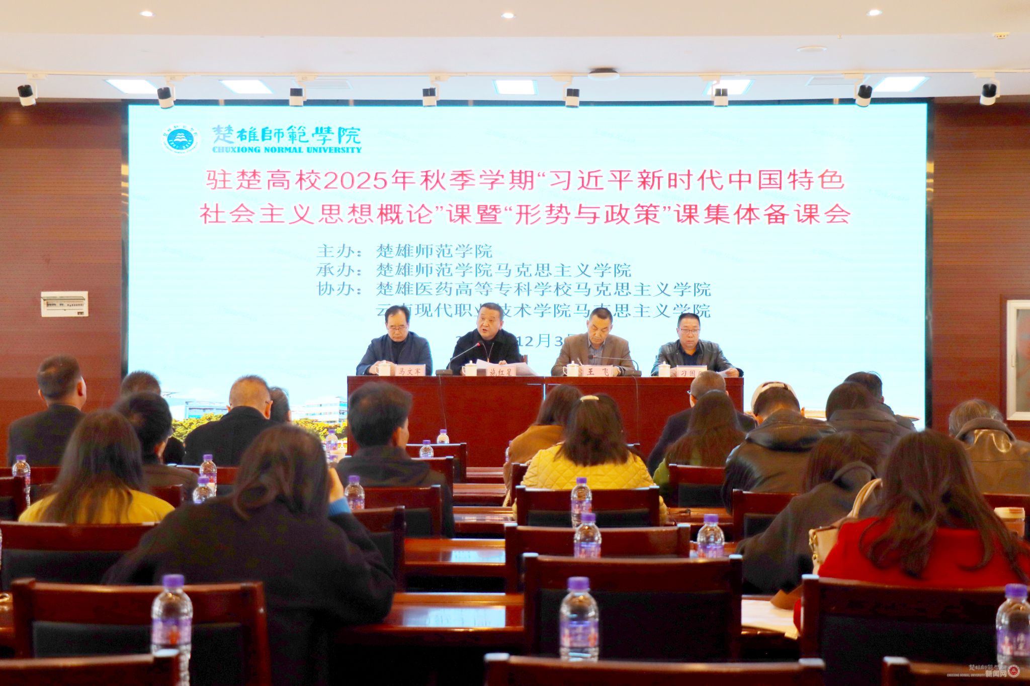 为深入学习贯彻党的二十届四中全会精神与习近平总书记关于高校思想政治理论课建设的重要论述,持续推进驻楚高校思政育人共同体建设,全面落实全国、全省新时代学校思政课建设推进会部署要求,12月3日,由我校主办的驻楚高校2025年秋季学期“习近平新时代中国特色社会主义思想概论”暨“形势与政策”课集体备课会在教师进修综合楼举行。学校党委副书记施红星出席会议并讲话,来自楚雄师范学院、楚雄医药高等专科学校、云南现代职业技术学院的80余名思政课教师参加备课会。