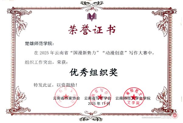 近日,由云南省作家协会、云南省写作学会、云南师范大学文学院联合主办的2025年云南省“国漫新势力”动漫创意写作大赛圆满收官。我校学子在本届比赛中表现突出,共提交33件作品,荣获12个奖项,包括二等奖2项、三等奖2项、优秀奖7项,学校获评“优秀组织奖”。