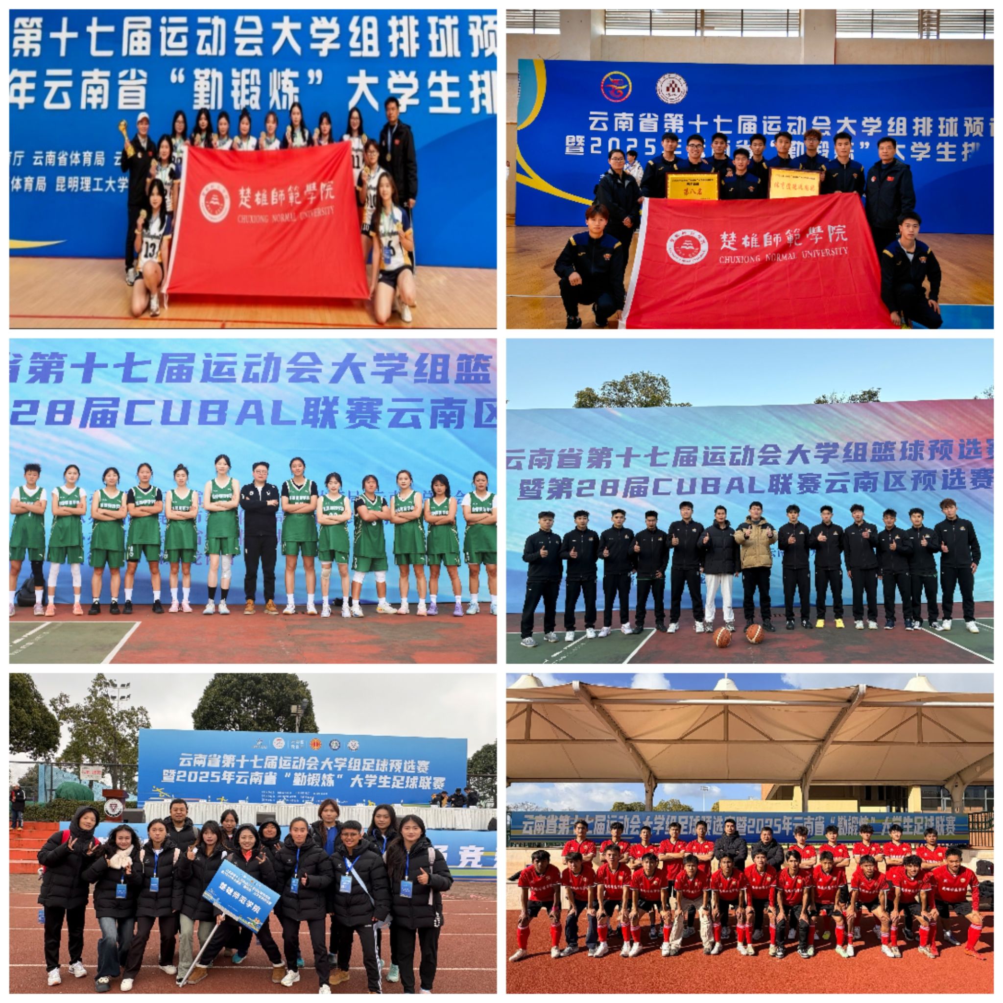近日,云南省第十七届运动会大学组三大球预选赛暨2025年云南省“勤锻炼”大学生三大球联赛圆满收官。我校派出男女排球、足球、篮球共六支代表队,凭借出色表现全部晋级省运会决赛阶段,在多个项目中斩获优异成绩,整体表现实现历史性突破。