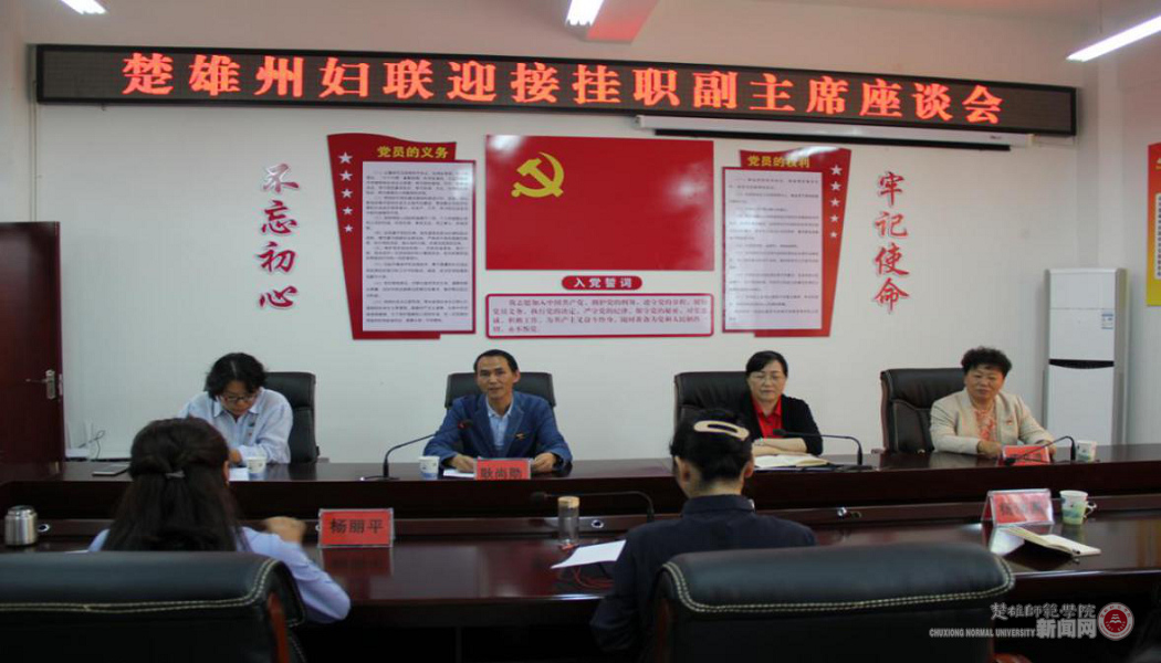 2020年9月30日上午,楚雄州妇联召开了“楚雄州妇联迎接挂职副主席座谈会”。政治与公共管理学院党委书记耿尚勋、院长陈文清、副院长雷敏出席会议。