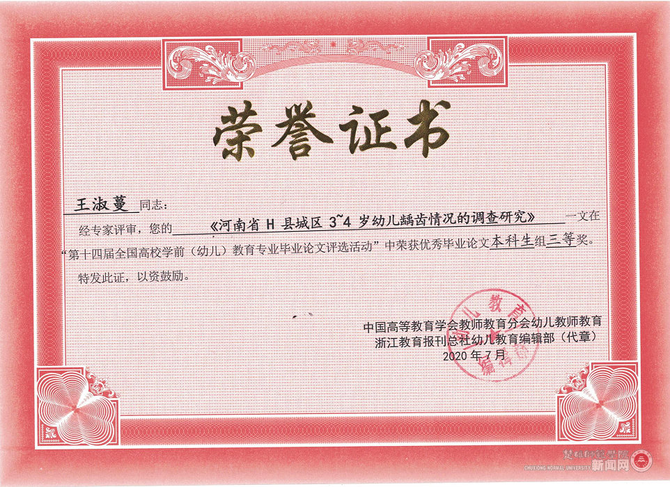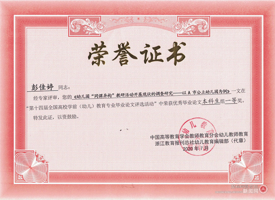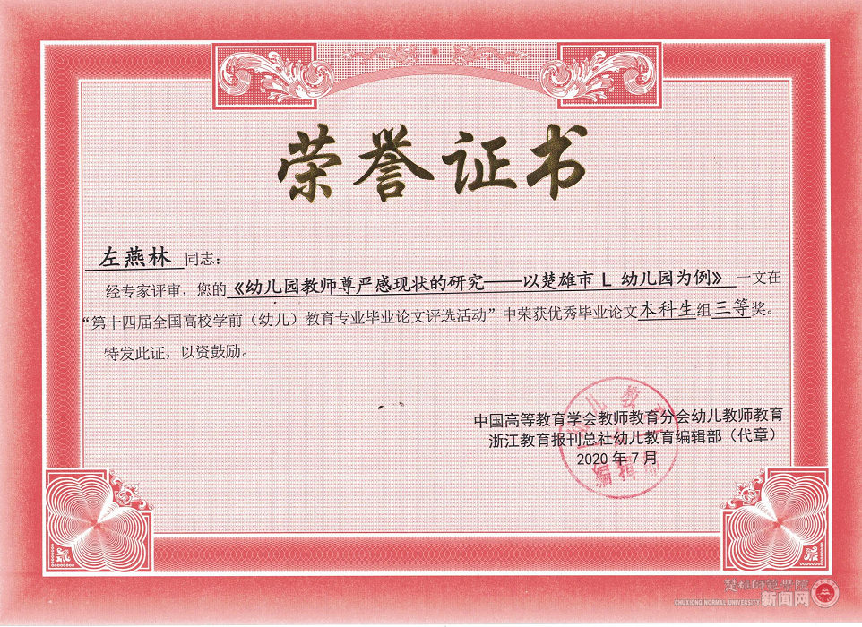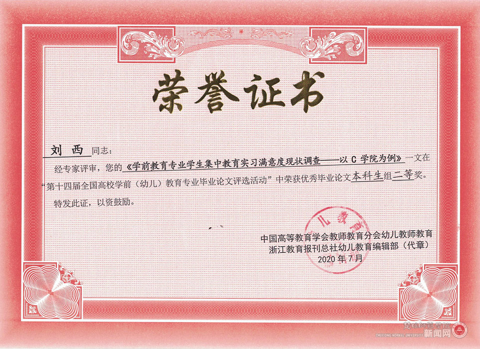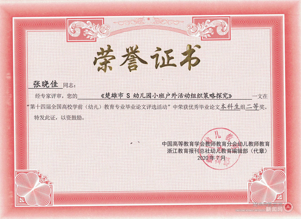 经过学前教育学院教师的精心指导,学生一遍又一遍的细致修改,我校选送的29篇毕业论文参与第十四届全国高校学前(幼儿)教育专业优秀毕业论文大赛。与全国20余省(市、自治区)80余所院校选送的1300余篇参评论文同台角逐,最终斩获佳绩,喜获一等奖2名,二等奖2名,三等奖3名。
