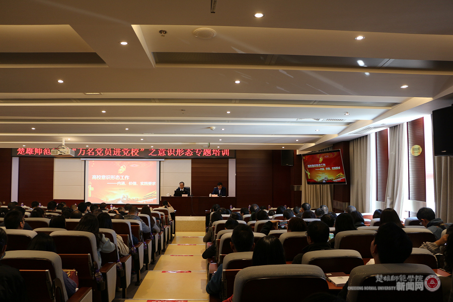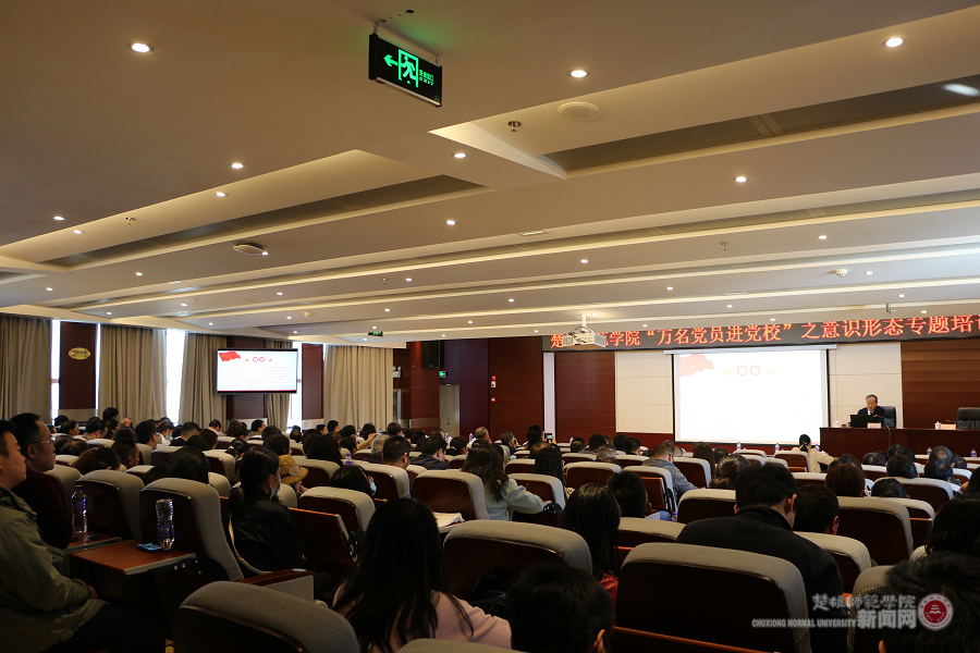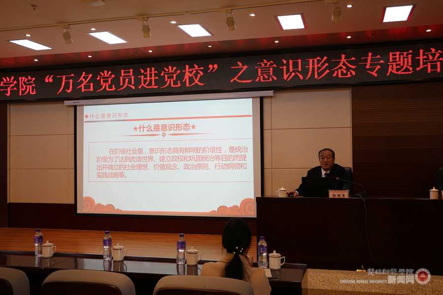 按照学校党委工作部署,结合学校2020年干部教育培训、“领导干部上讲堂”“党课开讲啦”等工作实际,11月17日下午,学校开展“万名党员进党校”第八次集中培训,学校党委副书记杨顺清应邀作题为《高校意识形态工作——内涵、价值、实践要求》的专题辅导报告。全校副科及以上领导干部、全体党支部书记、分团委书记、辅导员、组织员、班主任以及政治与公共管理学院、马克思主义学院全体教职工参加专题培训。党委委员、党委组织部部长周开进主持培训会。