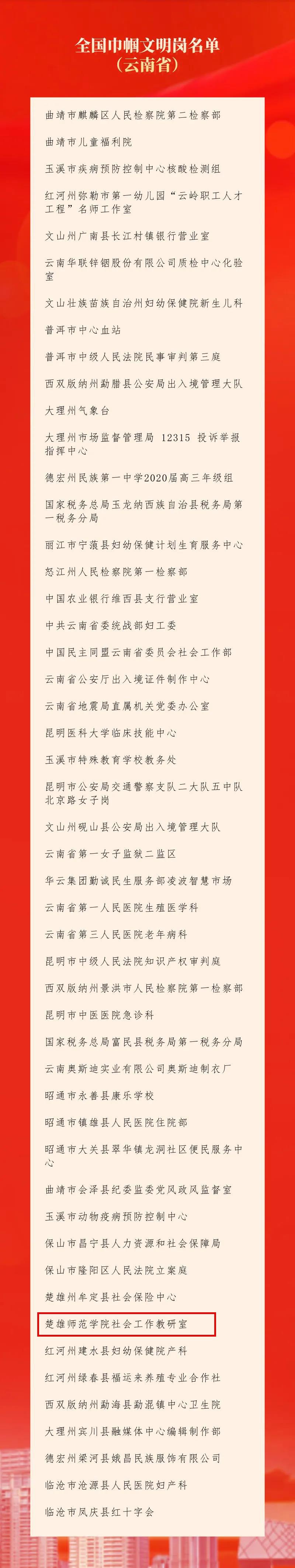 近日获悉,我校社会工作教研室被全国妇联授予“全国巾帼文明岗”荣誉称号。