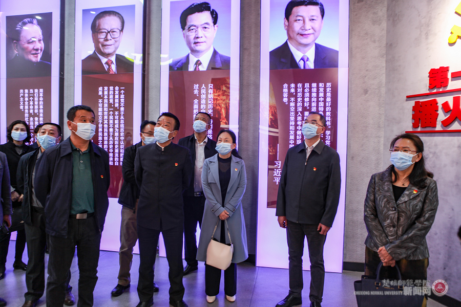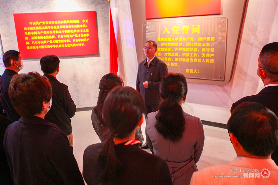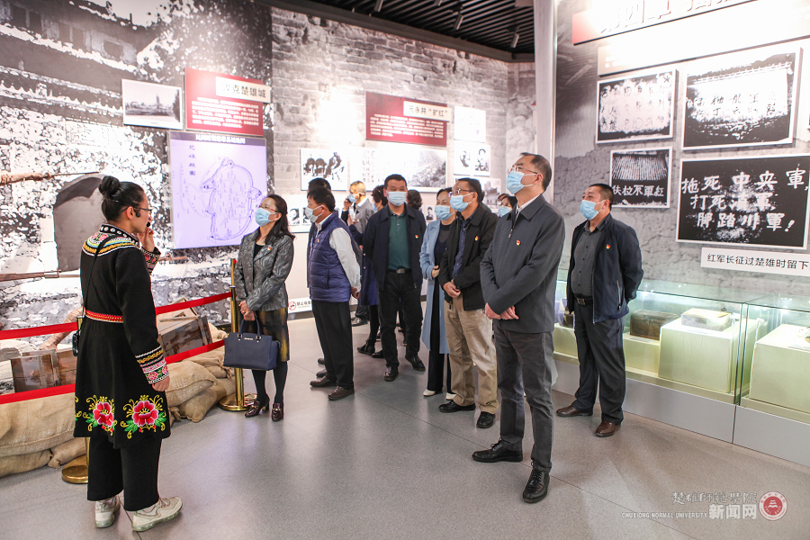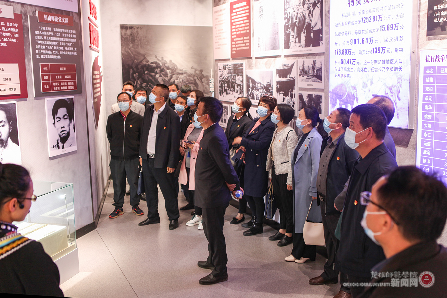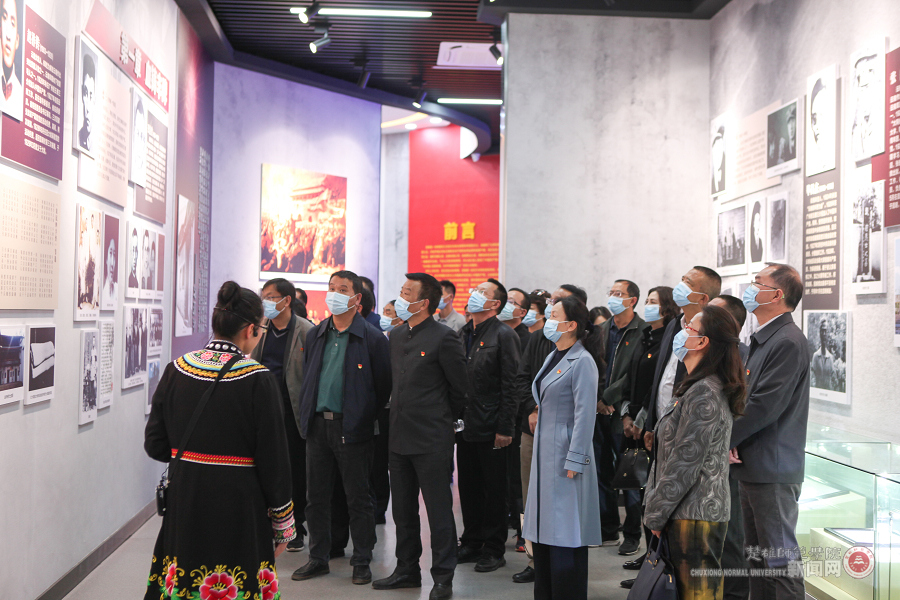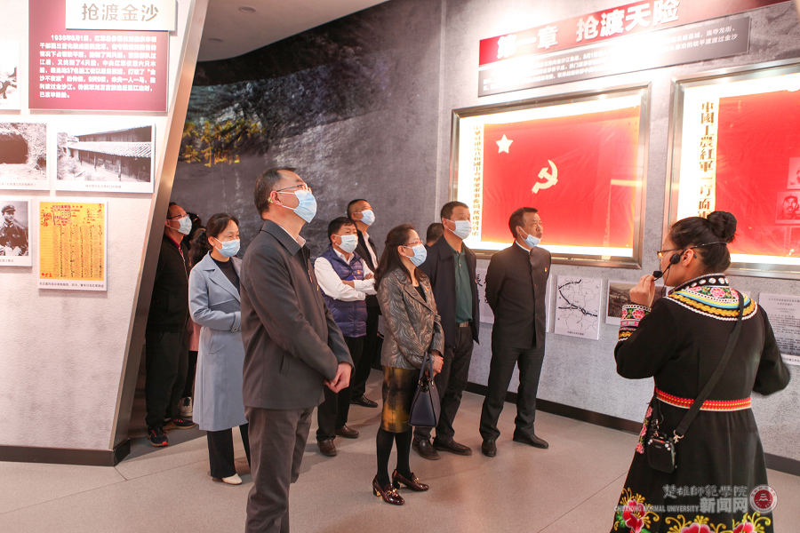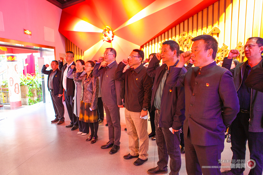 1919年五四运动之后,楚雄地区一批有志之士和进步青年开始觉醒,在外出求学的过程中积极投身到新文化运动和反帝反封建的革命斗争行列;1927年5月成立楚雄地区第一个党支部中共武定特别支部,揭开了党领导楚雄人民进行民主革命斗争的新篇章;1935年11月,成立了中共楚雄支部,并于次年发动了“三街暴动”,他们谋大义、顺大势,为楚雄解放作出了积极贡献。1935年5月和1936年4月,中央红军和红二、六军团长征两次过楚雄8县市,分别从云南禄劝皎平渡(时属楚雄)和丽江石鼓进入四川境内,2000多名楚雄英雄儿女参加红军,元谋江边、龙街、马头乐村和武定白路等地留下了红军红色宣传标语,留下了革命的火种。学校立足楚雄,办学渊源可追溯到1936年10月6日正式成立的省立镇南师范学校,1938年12月,经中共云南临时省委批准,镇南师范地下党支部正式成立。楚雄这片红色热土,具有光荣的革命传统,党史资源丰富。学校党委班子全体成员、学校党史学习教育领导小组全体成员抵达楚雄州党史党性教育基地,在讲解员的引导下,听取了“播火先驱、金沙水拍、抗日救国、解放号角、走向新生”五个单元的专题讲解。在鲜红的党旗面前,党委副书记、校长王资带领大家重温了入党誓词。