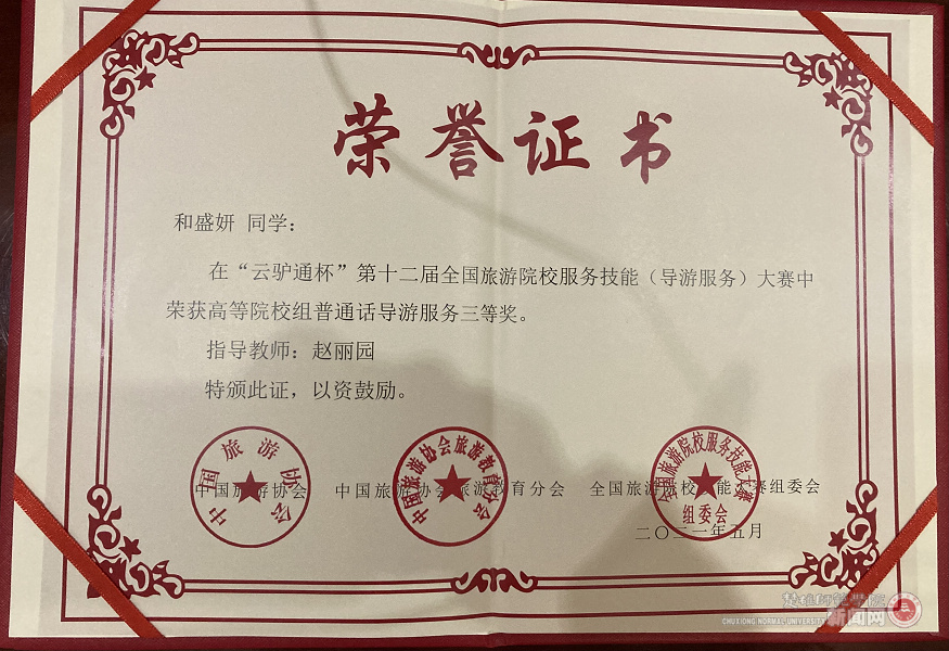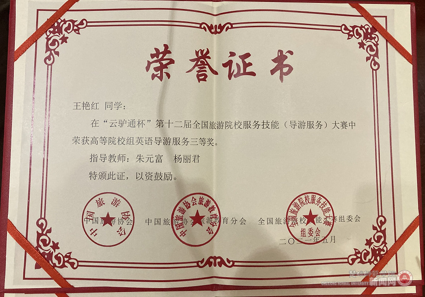 近日获悉,我校学生在“云驴通杯”第十二届全国旅游院校服务技能(导游服务)大赛获奖。