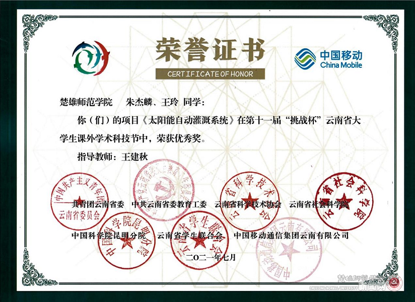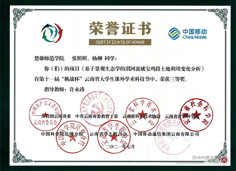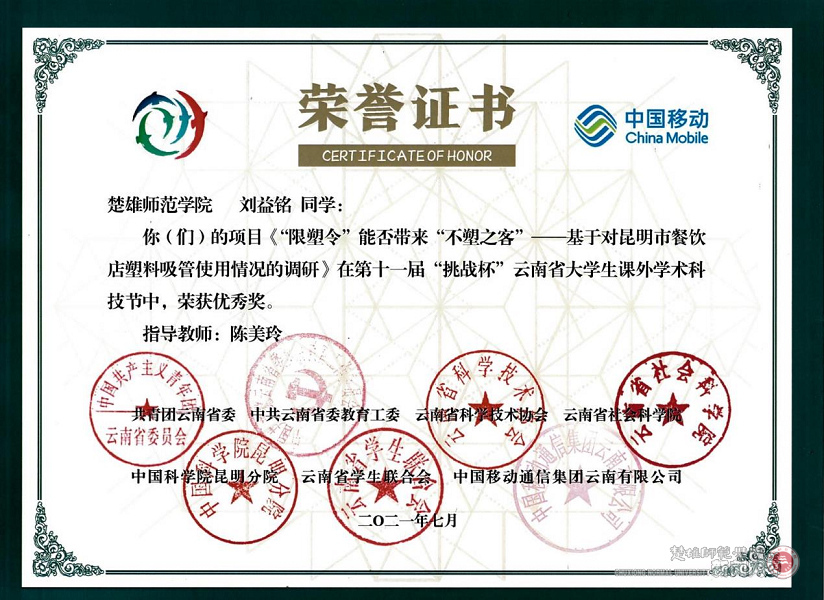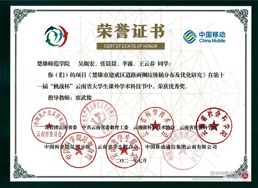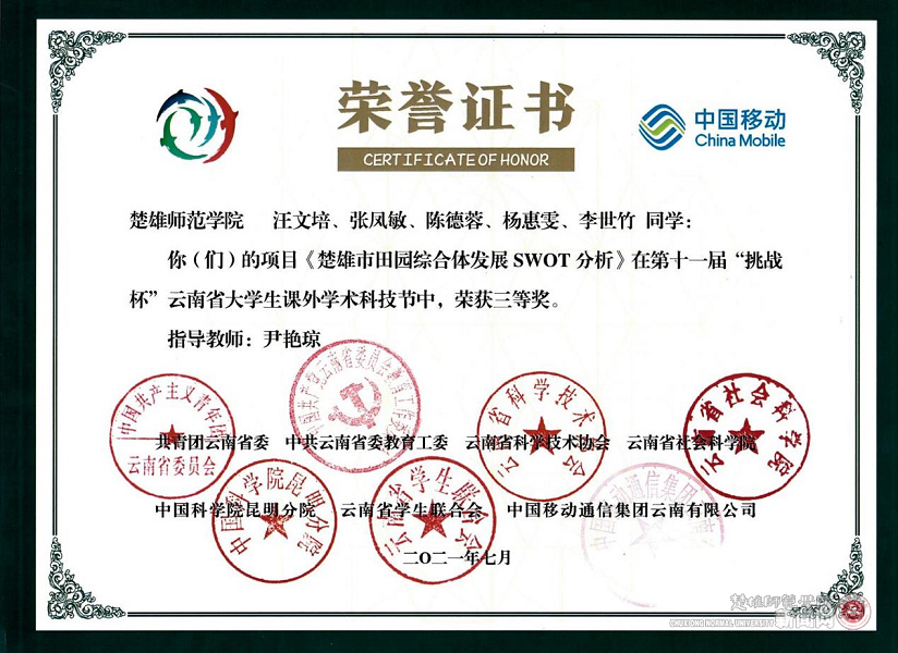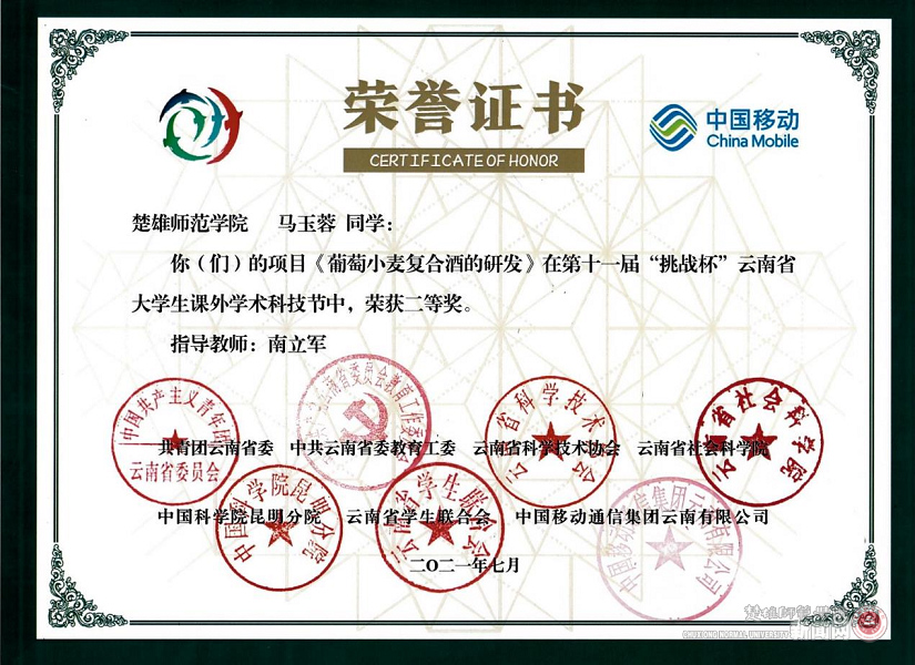 “挑战杯”是由共青团中央、中国科协、教育部和全国学联、举办地人民政府共同主办的全国性的大学生课外学术实践竞赛。5月14至15日,第十一届“挑战杯”云南省大学生课外学术科技节终审决赛在云南中医药大学举行。经过校级比赛,好中选优,每个学校限报15件作品,省级组委会共收到全省56所高校的600余件作品,作品涉及自然科学类学术论文、哲学社会科学类社会调查和学术论文、科技发明制作等三个领域。我校共有11件作品获奖,其中二等奖1项,三等奖2项,优秀奖8项。