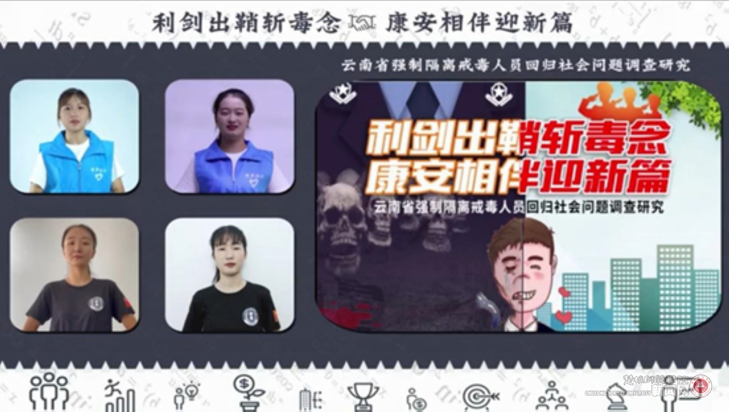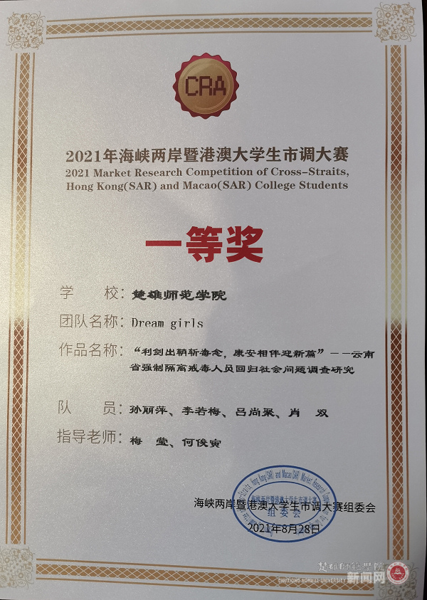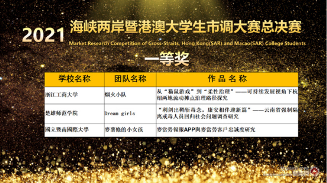 8月28日,2021海峡两岸暨港澳大学生市调大赛总决赛在线上成功举办,我校管理与经济学院市场营销、金融学专业肖双、孙丽萍、吕尚聚和李若梅四名同学在梅莹、何俊寅老师的指导下,以作品《“利剑出窍斩毒念,康安相伴迎新篇”——云南省强制隔离戒毒人员回归社会问题调查研究》代表大陆地区院校参赛,与两岸四地的代表团队同场竞技,并荣获一等奖。