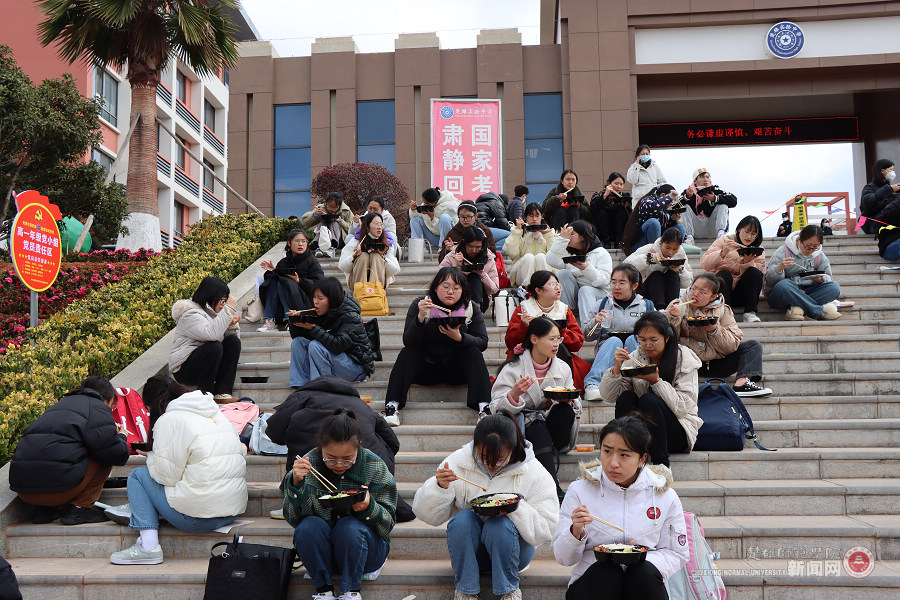 12月24日、25日中午,后勤总务部工作人员打包1200余份盒饭,送到考点门口,工作人员组织学生有序发放盒饭和进餐。