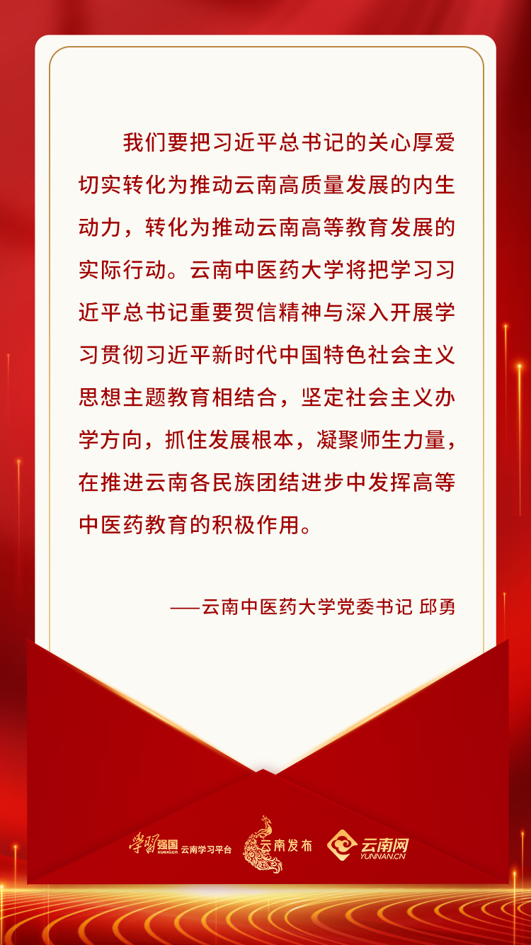 习近平总书记对云大百年校庆的重要贺信深深激励和鼓舞着云南各族人民。我们要把习近平总书记的关心厚爱切实转化为推动云南高质量发展的内生动力,转化为推动云南高等教育发展的实际行动。为党育人,为国育才,扎根边疆民族地区,努力培养云南经济社会发展所需人才,为促进民族团结进步和区域经济社会发展作出应有贡献。云南中医药大学将把学习习近平总书记的重要贺信精神与深入开展学习贯彻习近平新时代中国特色社会主义思想主题教育相结合,坚定社会主义办学方向,抓住发展根本,凝聚师生力量,在推进民族团结进步中发挥高等中医药教育的积极作用。