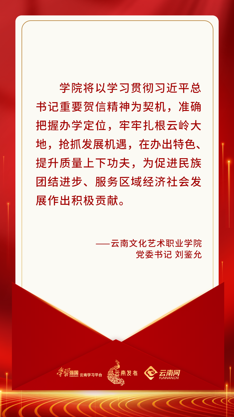 习近平总书记致云南大学建校100周年的重要贺信,不仅是对云南大学的充分肯定、殷切期望,也是对云南高等教育事业和高校建设发展的关注,为当下和未来指明了方向,也为云南文化艺术职业学院在新时代新征程的新发展提供了根本遵循。学院将以学习贯彻习近平总书记重要贺信精神为契机,准确把握办学定位,牢牢扎根云岭大地,抢抓发展机遇,在办出特色、提升质量上下功夫,为促进民族团结进步、服务区域经济社会发展作出积极贡献。