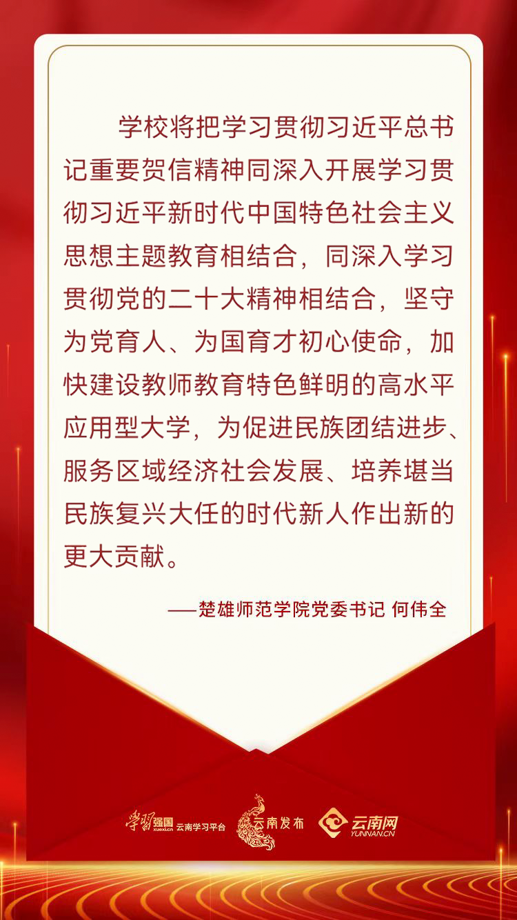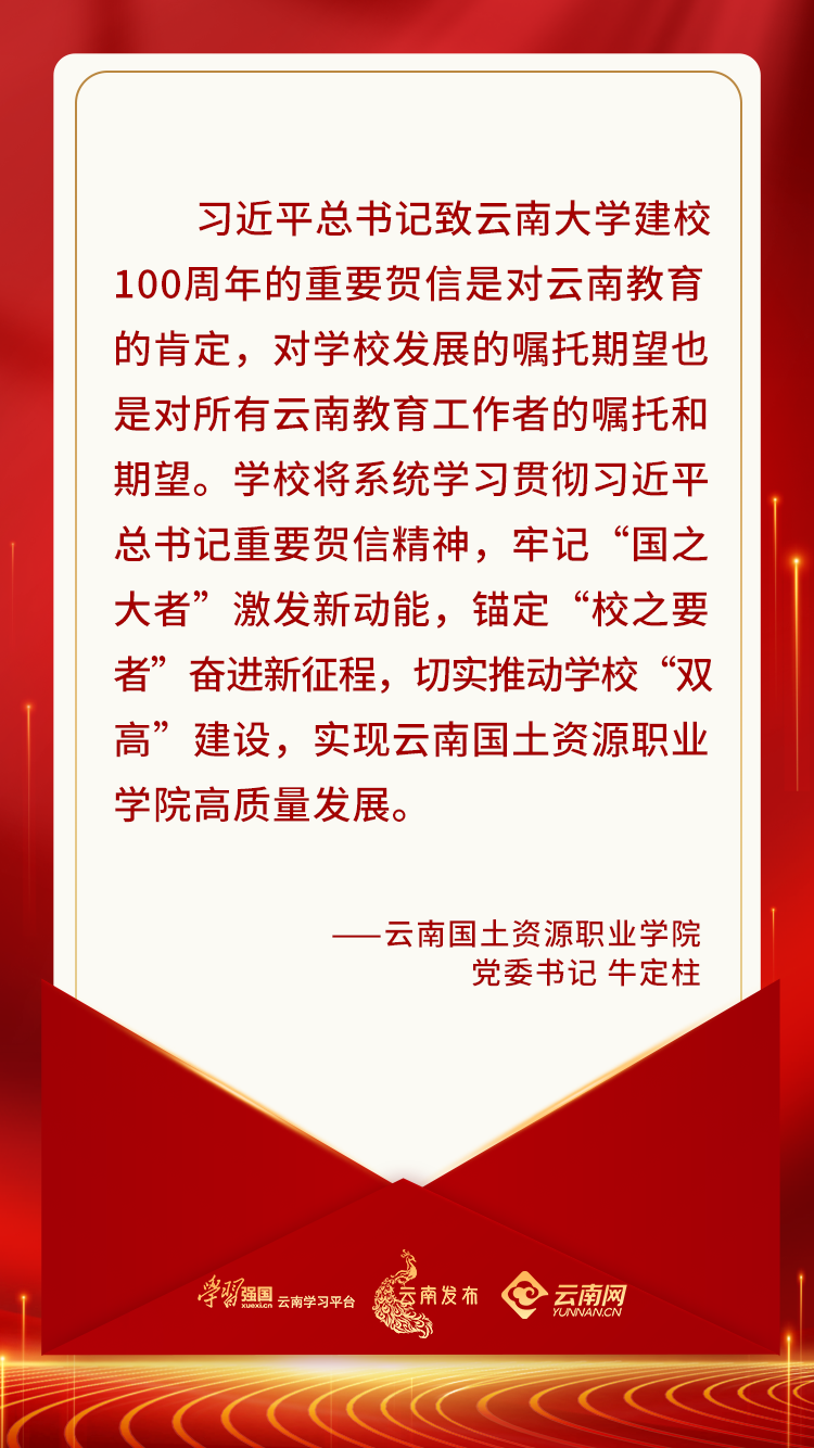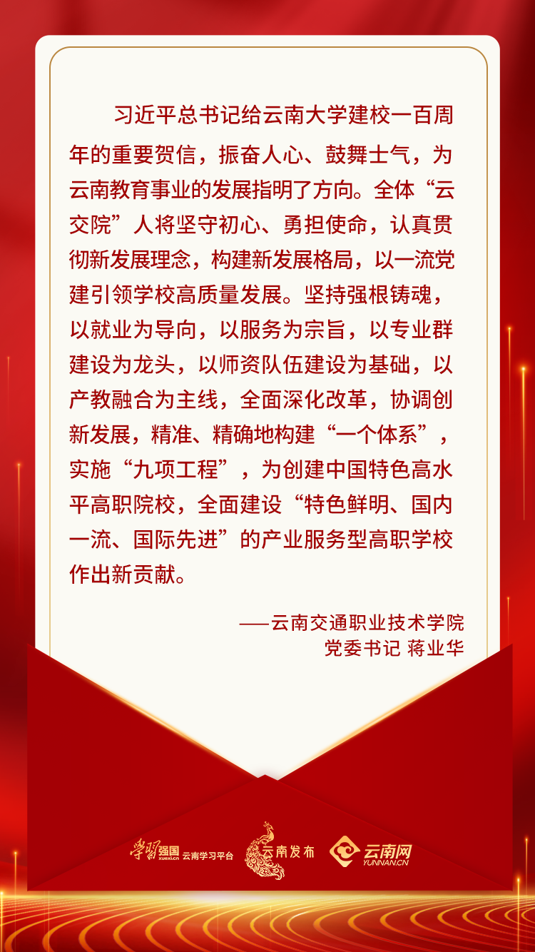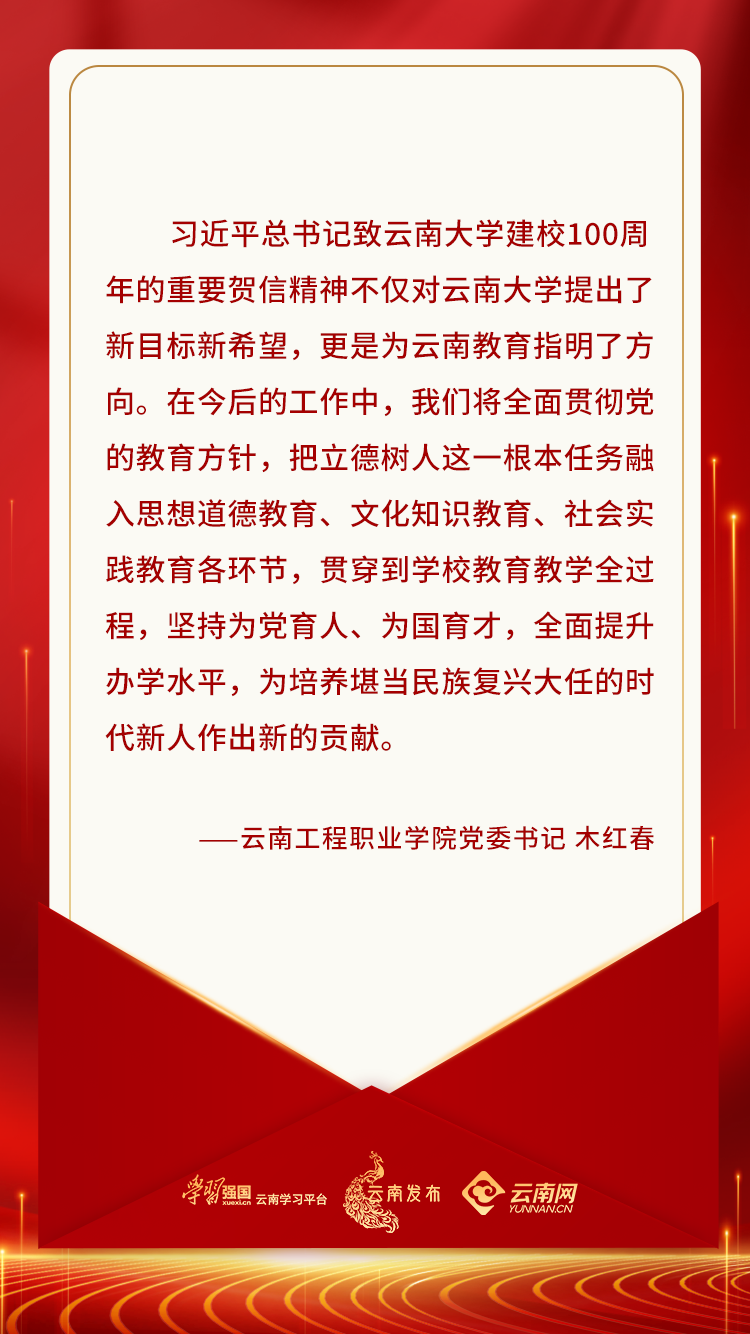 习近平总书记致云南大学建校100周年的重要贺信不仅对云南大学提出了新目标新希望,更为云南教育指明了方向。作为一名高校党委书记,我深感责任重大、使命光荣。在今后的工作中,云南工程职业学院将全面贯彻党的教育方针,把立德树人这一根本任务融入思想道德教育、文化知识教育、社会实践教育各环节,贯穿到学校教育教学全过程,坚持为党育人、为国育才,全面提升办学水平,为培养堪当民族复兴大任的时代新人作出新的贡献。