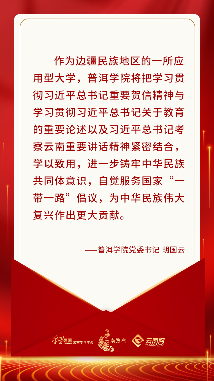 习近平总书记的贺信充分体现了党中央对云南大学、对云南高校的殷切关怀和高度关注。作为边疆民族地区的一所应用型大学,普洱学院将把学习贯彻习近平总书记重要贺信精神与学习习近平总书记关于教育的重要论述以及学习贯彻习近平总书记考察云南重要讲话精神紧密结合,学以致用,进一步铸牢中华民族共同体意识,为中华民族伟大复兴作出更大贡献。