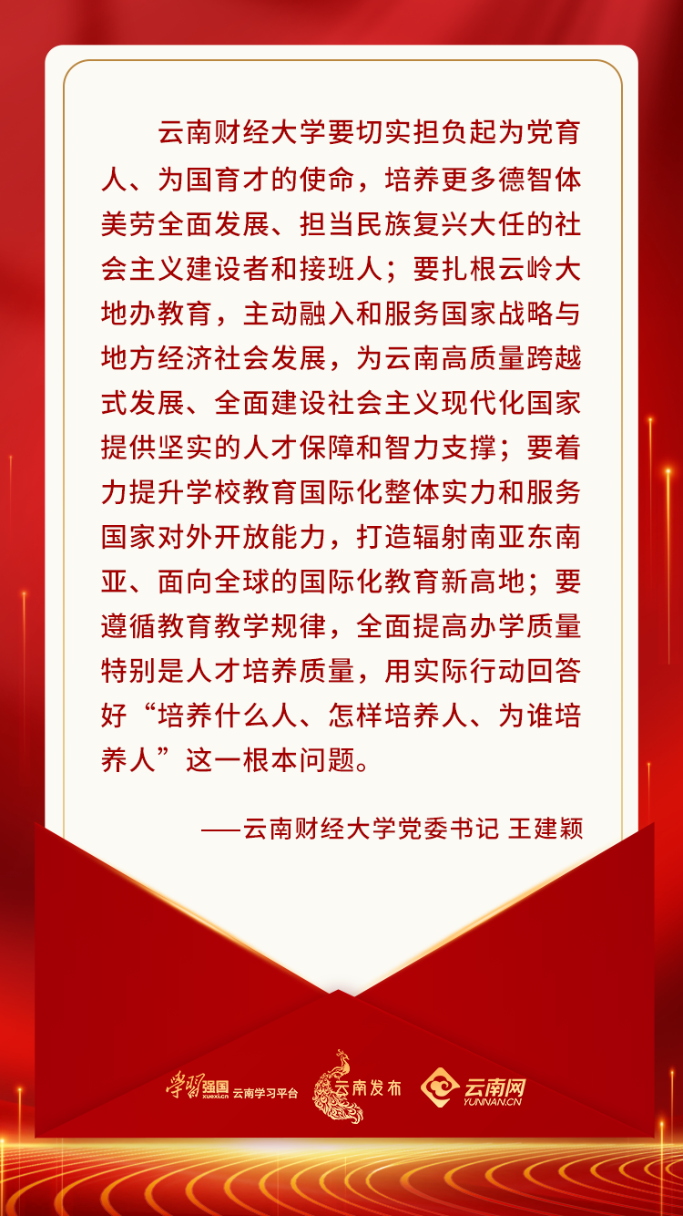 习近平总书记致信祝贺云南大学建校100周年,令人鼓舞、催人奋进。云南财经大学要切实担负起为党育人、为国育才的使命,培养更多德智体美劳全面发展、担当民族复兴大任的社会主义建设者和接班人;要扎根云岭大地办教育,主动融入和服务国家战略与地方经济社会发展,为云南高质量跨越式发展、全面建设社会主义现代化国家提供坚实的人才保障和智力支撑;要着力提升学校教育国际化整体实力和服务国家对外开放能力,打造辐射南亚东南亚、面向全球的国际化教育新高地;要遵循教育教学规律,全面提高办学质量特别是人才培养质量,用实际行动回答好“培养什么人、怎样培养人、为谁培养人”这一根本问题。