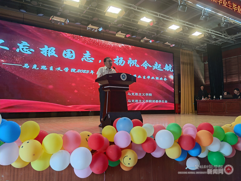 第二篇章为“不忘报国志”的爱国教育篇章。马克思主义学院谭斌教授作为教师代表,以临别寄语的形式为毕业生讲授最后一课,勉励毕业生要始终爱党、爱国、爱校,毕业后要始终保持爱社会主义、爱家乡、爱家人的情怀,时刻牢记社会主义核心价值观,把个人层面的“爱国敬业诚信友善”融入到工作和生活中,立足岗位做奉献,把全国文明校园的身影折射到生活的方方面面。毕业生代表与在校生代表在活动中发言,并一致表示:2023届毕业生即将离校,奔赴理想,发扬母校“笃学尚行,扬美崇善”校训精神的接力棒交到了在校生手中,楚师学子定将努力学习、认真工作,厚植家国情怀、涵养进取品格,以奋斗姿态激扬青春,不负时代,不负韶华。