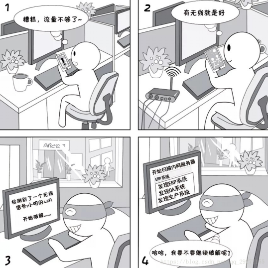 无线路由器有较多的安全隐患,比如,之前的WEP认证能很轻易破解。个人架设无线路由器,如果配备不当会导致蹭网或个人资料泄露,在公司使用可能导